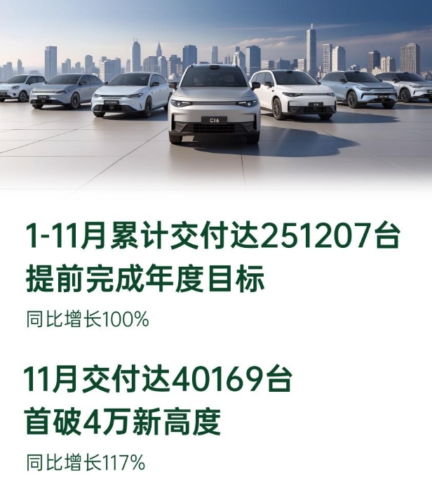 零跑在2024年11月达成了单月销量首次突破4万台,达到了40169台。同时,零跑在前11个月累计交付251207台,成为首家提前完成全年销量目标的车企。 零跑的销量增长趋势显著,已连续6个月创下月销量新高。特别是今年上市的零跑C10和C16,前者从上市到月销破万仅用了6个月,后者仅用了4个月。此外,全新B系列的推出,首款车型B10完成国内首发,预计将在2025年一季度上市,成为零跑新的增长点。 随着销量的持续攀升,零跑的未来交付量和2025年销量目标令人期待。