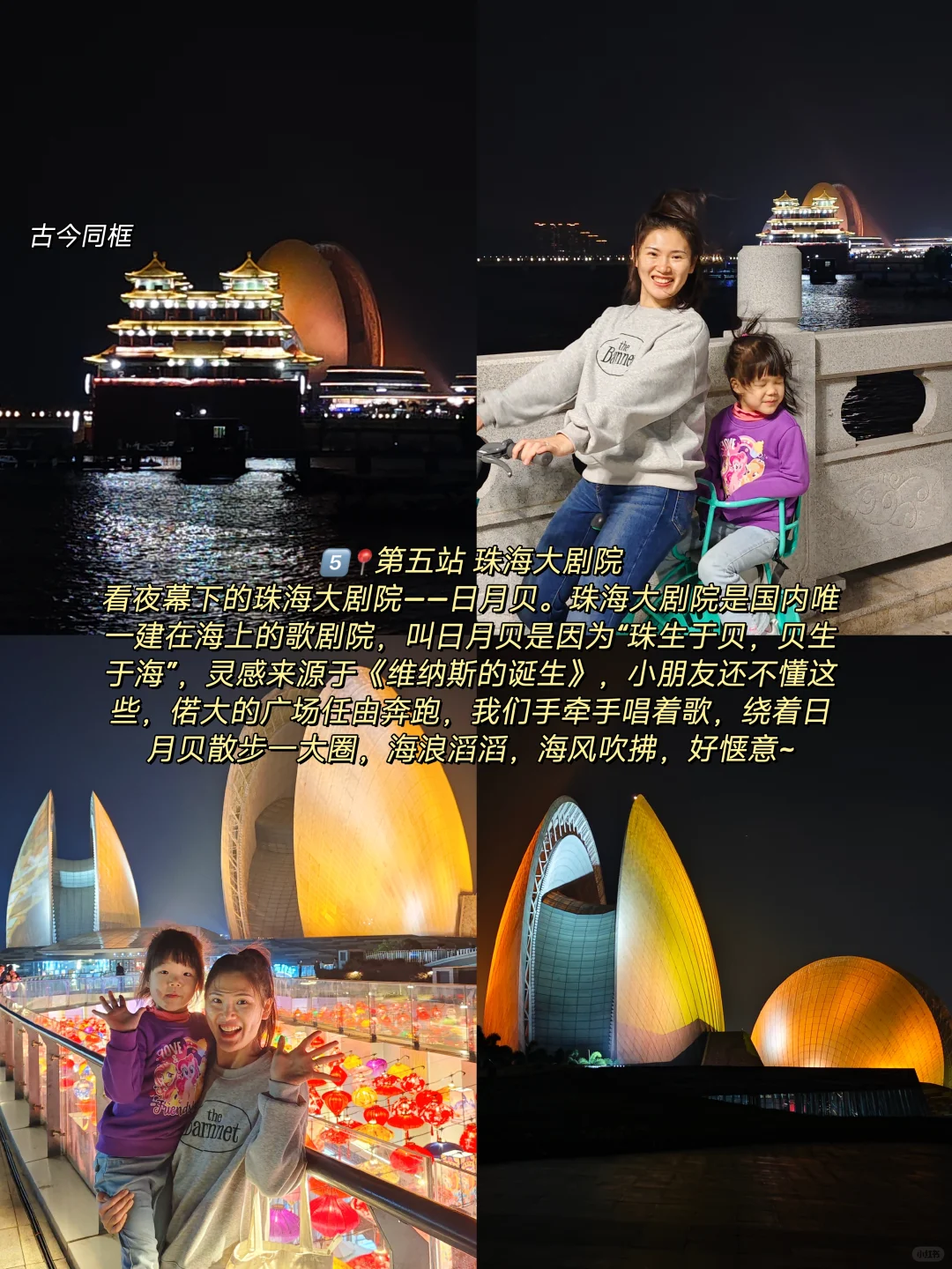 看夜幕下的珠海大剧院——日月贝。珠海大剧院是国内唯一建在海上的歌剧院,为什么叫日月贝,因为“珠生于贝,贝生于海”,灵感据说来源于《维纳斯的诞生》,小朋友还不懂这些,偌大的广场任由奔跑,我们手牵手唱着歌,绕着日月贝散步一大圈,海浪滔滔,海风吹拂,好不惬意