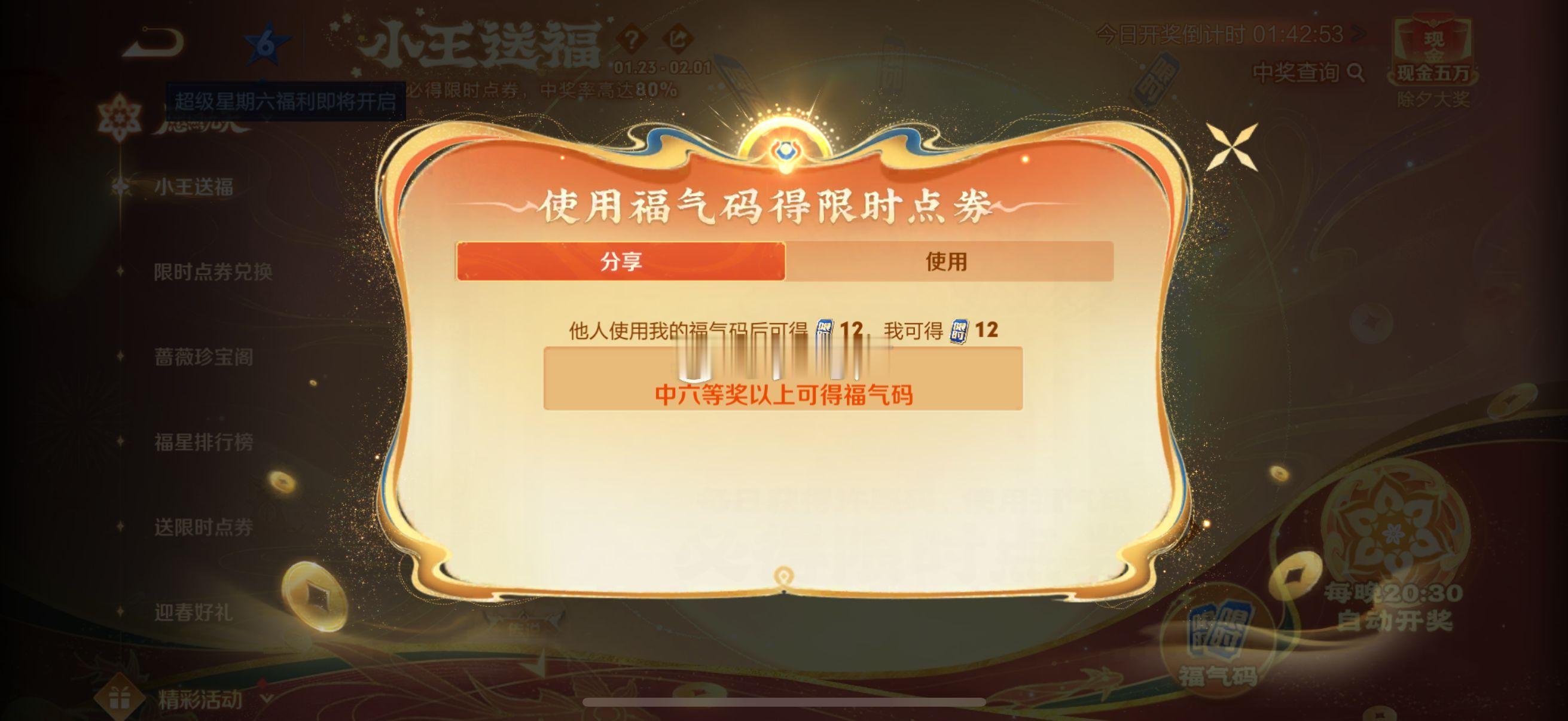 王者荣耀福气码活动还没开始,每晚8:30开奖!6等奖以上才有福气码!才能分享!解