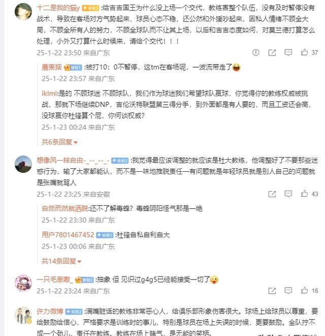 除将帅不和外,广东男篮部分球员表现低迷。张皓嘉全场三分三投零中,防守漏洞频出;张文逸外线投篮命中率惨淡,九投一中,并出现两次失误;任骏飞替补上场六分钟,两次低位单打未果,防守同样不力。球迷对此深感失望,纷纷呼吁开除这“三大水货”,调整球队阵容。