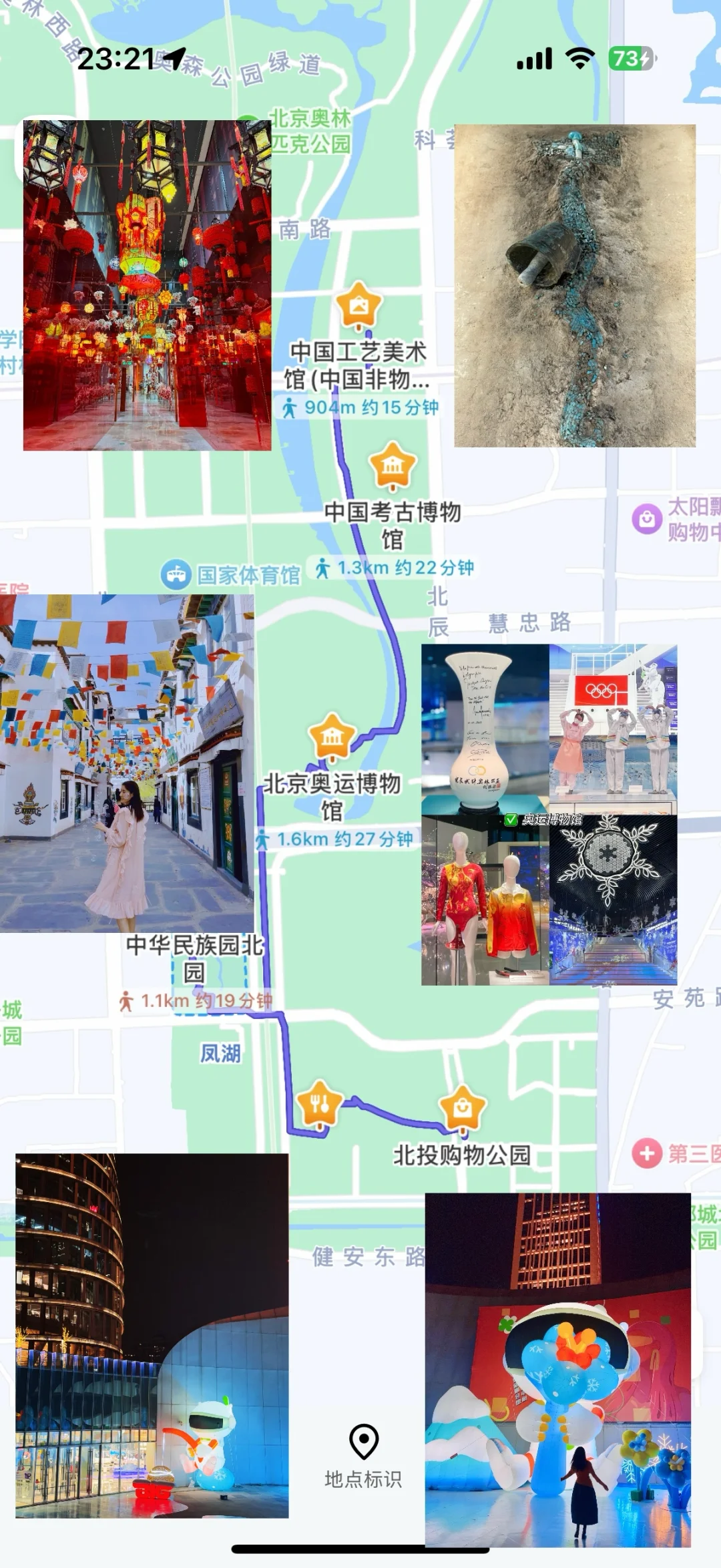 最近在奥森附近又发现一条小众宝藏路线 🉑文艺🉑时尚,吃🍽️喝🍺玩乐 逛展、购物🛍️、拍照打卡 一应俱全‼️ 有需要宝子,提前码住✅ 🚶City walk路线 工艺美术馆➠考古博物馆➠奥运博物馆➠中华民族园北园➠北投购物公园🛍️ 📍北投购物公园⛲️ 超级有设计感的宝藏商场,吃喝玩种类很多,还在东区B1层看到了超大雪人装置⛄️好好拍,雪花5倍拍摄也太有故事感了❄️ 商场里面还有沉浸式剧本杀、国图书店、特色露营风咖啡店☕️油画体验、射箭俱乐部,太适合解压和周末溜娃了💕 📍中华民族园 两小时逛遍少数民族园,必看:藏族、傣族、土家族、布依族、高山族、羌族 🚇| 8号线奥体中心站D口出 ⏰ | 周一至周日8:30-18:00 🎫 | 45r 不需预约 📍奥运博物馆 📌 展馆1.9万平方,共两层,重点在B1 .,上千件“夏奥”“冬奥”的展品,十几项互动体验和影片,可免费讲解 ⏰开放时间: 周二-周日9:00-17:00周一闭馆 📅免预约/免门票刷身份证🪪进 🚇地铁: 8号线奥体中心站 📍中国考古博物馆 📌听说很难预约得宝藏博物馆,展品主要是出土的文物,在这里可互动体验和观看3D沉浸式影片🎦 ⏰开放时间:周二-周日 9:00-16:30(周一闭馆) 🎫门票:免费/提前3天预约 🚇地铁: 8号线地铁奥林匹克公园站D口 📍中国工艺美术馆 📌都是国 家级非遗的宝藏藏品,有常设展和临时展!逛展🉑从6楼向下逛!负一层有盖章的地方 ⏰开放时间:周二-周日9:00-17:00周一闭馆 🎫门票:免费🆓需GZH提前预约
