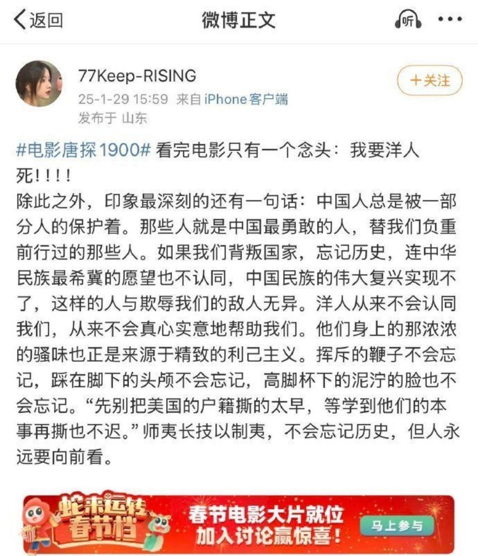 正式上映后,影片热度持续飙升。在竞争激烈的 2025 年春节档,大年初一当天,《唐探 1900》票房成绩斐然,以 4.33 亿元的票房成绩名列前茅,截至后续统计时段,票房更是达到了 5.48 亿元,成为春节档票房榜的有力竞争者。这样的票房成绩,不仅证明了影片前期宣传的成功,更反映出观众对 “唐探” 系列 IP 的深厚情感与期待。 从预售阶段的一路领先,到上映首日的高票房收入,《唐探 1900》在开年之际就展现出了强大的市场号召力,吸引着无数观众走进影院,迫不及待地想要揭开这部影片的神秘面纱。