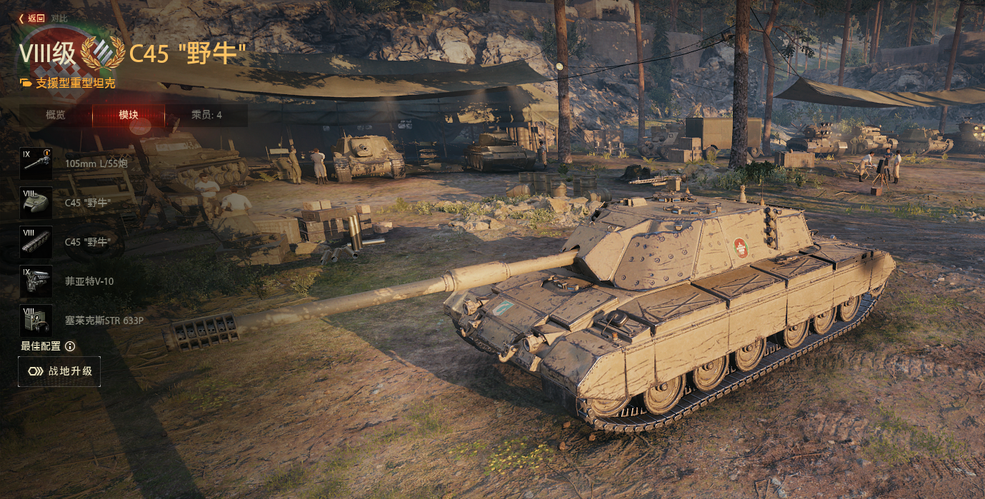 放在金币礼包的C45野牛则是一台历史悠久,也是意系重坦线的八金重坦。它的360单发+三连发弹鼓的输出能力不错。装甲也较为靠谱,卖头的时候也不错。综合下来,野牛在今天依旧有一战之力。