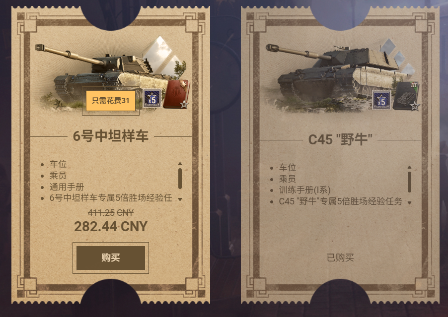 不过这次夏促的重头戏还是每日刷新的RMB礼包和金币礼包,这两个礼包每天都会提供两台不一样的金币坦克,且同时享受七折优惠!今天出现在里面的分别是六号中坦样车和C45野牛,也是性能都不错的坦克。
