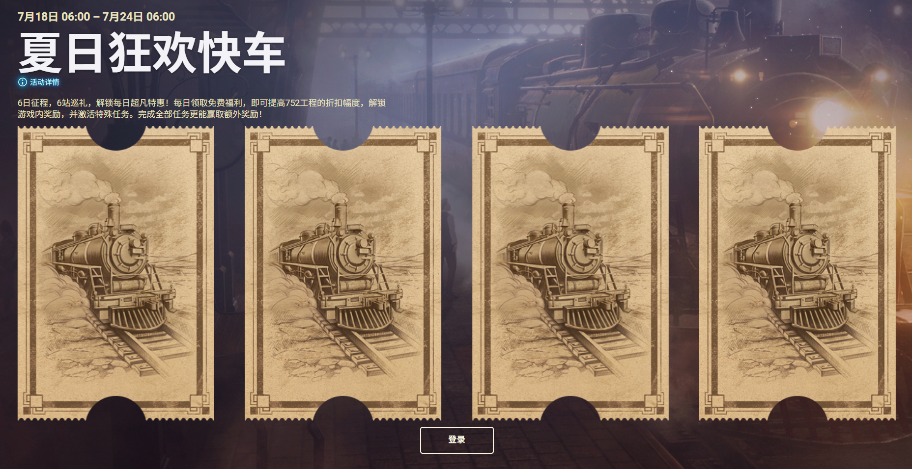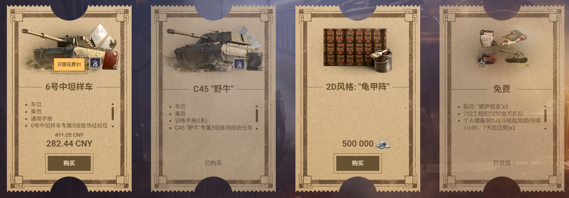 这个活动每天都会刷新四份礼包,分别为免费礼包、银币礼包、金币礼包和rmb礼包,其中每天的免费礼包里还包含一个提供给752工程终极礼包的折扣,想要752工程的车长们千万不要错过了!