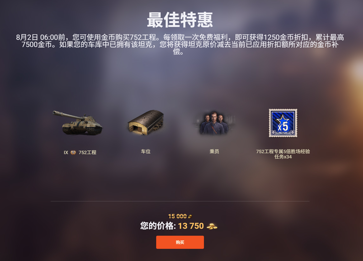 每天可以领到1250金币的折扣,六天全部拿满就可以享受752工程礼包的五折优惠,能花7500金币拿下这台强势9金重坦还是比较划算的!