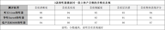 测评方法:本次测试,我播放了同一段立体声音频,重点关注三款助听器在音质清晰度、真实度、细腻度和层次感方面的表现,然后对维度进行评分。