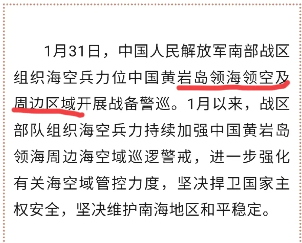 中国对菲律宾施加的战略压力,越来越大!就在昨天,我南部战区发声,宣布于1月31号再次战巡黄岩岛领海领空和周边区域!这是一个月内,南部战区对该位置实施的第三次联合战巡,同时,声明中所称的“周边区域”究竟包括哪里?是不是深入了菲律宾海岸线上空?