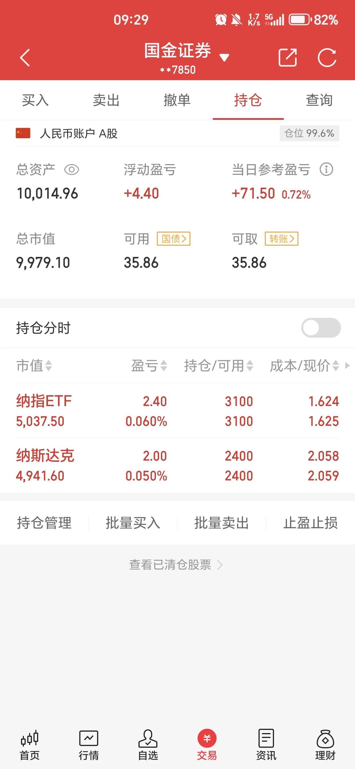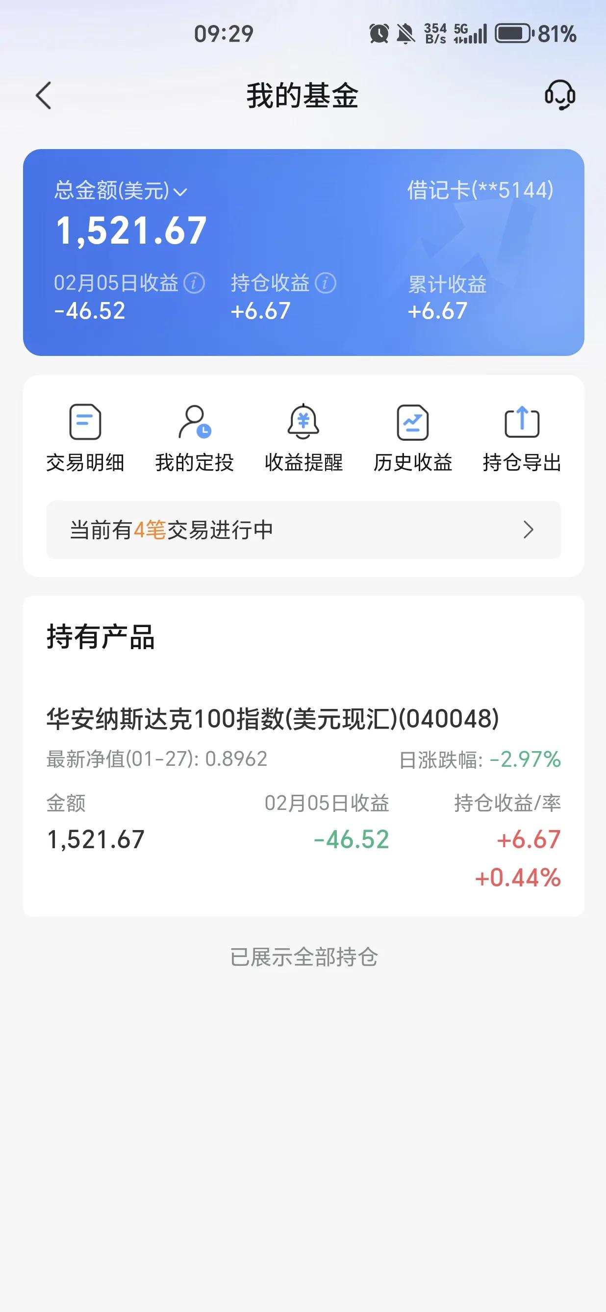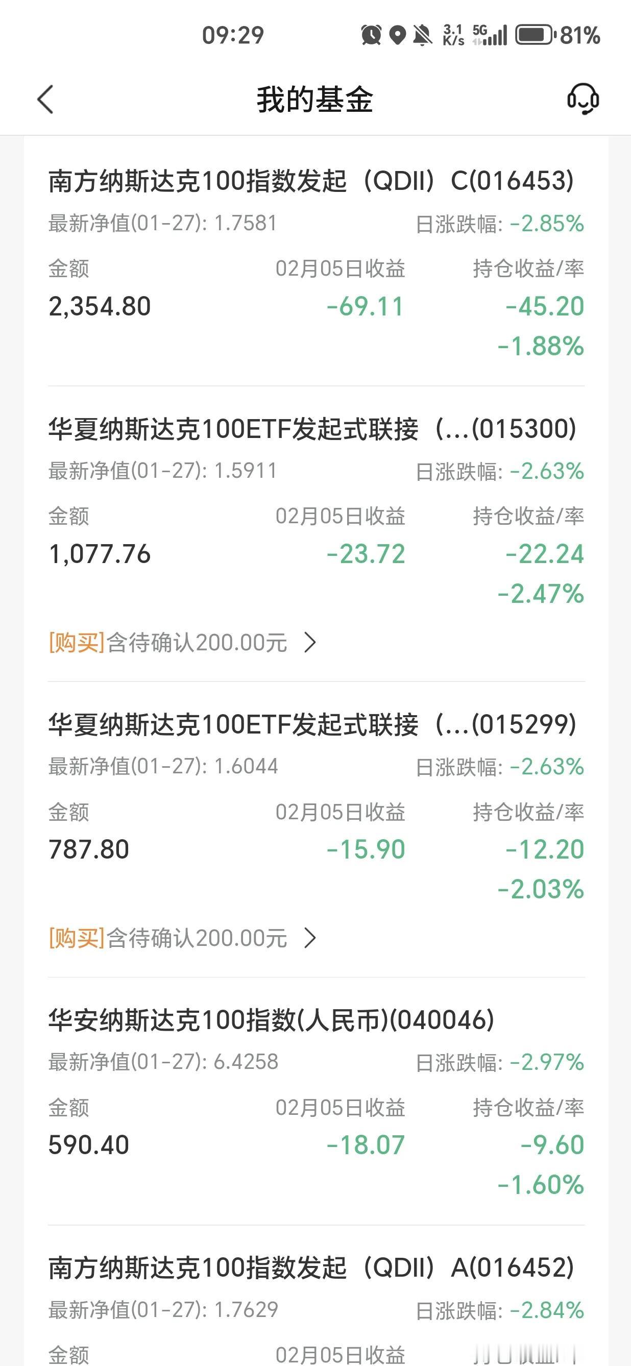 新年第一天加仓纳斯达克指数基金,今天起来看到美股走势感到欣慰,昨天加对了。 受到假期影响,场外基金更新为1月27日净值大跌,收益基本全部回撤(已加仓)。 新年第一天投资自己获得了好的回报,新的一年一个好的开端。是否也预示着新的一年有好的回报。 投资纳指基金是极少数人能够认识到投资的逻辑并且只有很少的投资人可以坚持长期持有。如果有小伙伴愿意学习,可以一起交流。 目前等待纳指基金新高后,将暂停场外基金的购买,并会持续持有,同时场内基金会调整为每月定投并持有。 今天你投资自己未来了嘛???