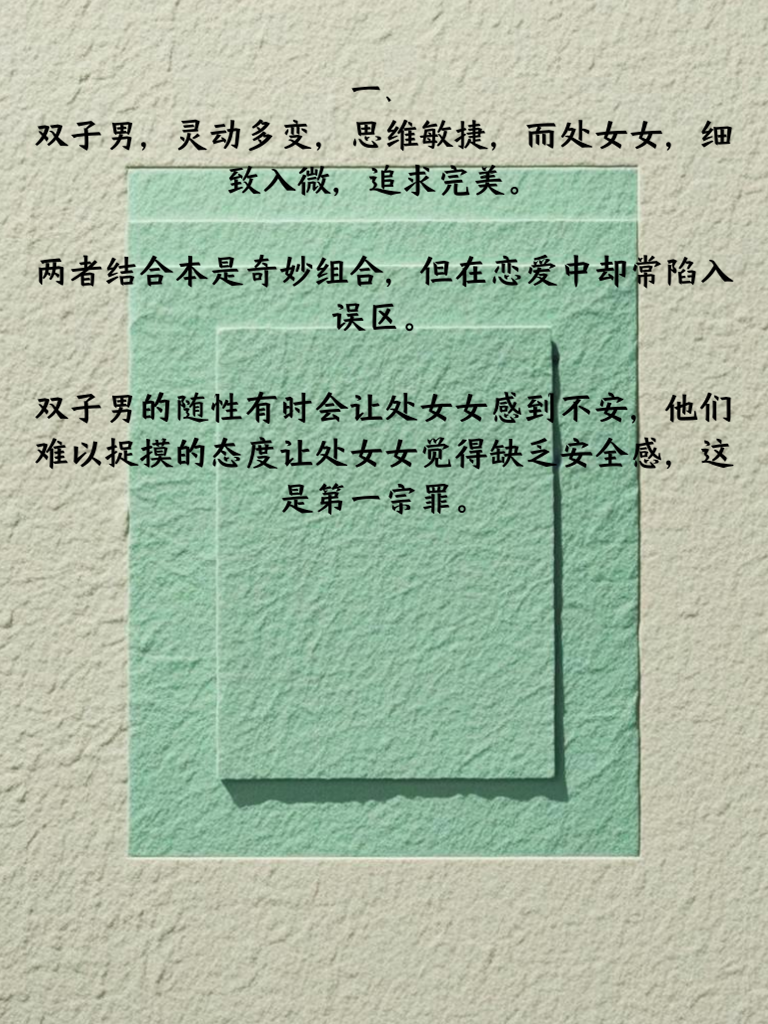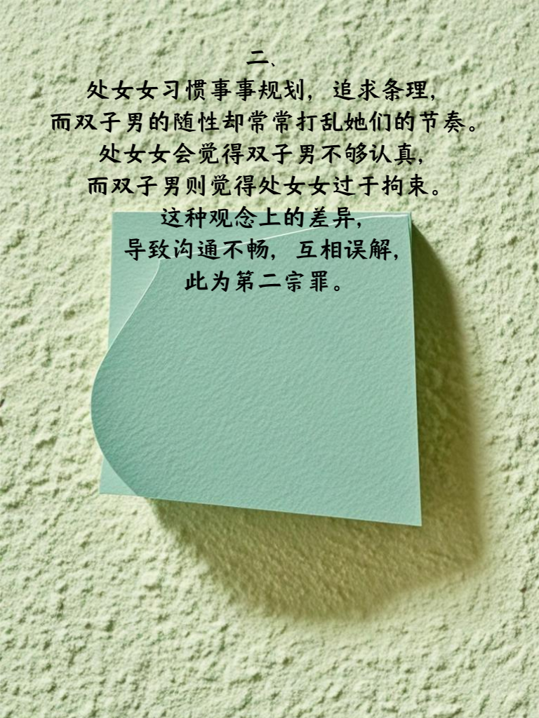 一、双子男,灵动多变,思维敏捷,而处女女,细致入微,追求完美。两者结合本是奇妙组合,但在恋爱中却常陷入误区。双子男的随性有时会让处女女感到不安,他们难以捉摸的态度让处女女觉得缺乏安全感,这是第一宗罪。 二、处女女习惯事事规划,追求条理,而双子男的随性却常常打乱她们的节奏。处女女会觉得双子男不够认真,而双子男则觉得处女女过于拘束。这种观念上的差异,导致沟通不畅,互相误解,此为第二宗罪。 三、在处理感情问题时,双子男往往不够坚定,容易被外界干扰。而处女女则一旦认定,便全心全意。这种差异在面对困难时尤为明显,双子男的摇摆不定会让处女女感到失望,这是第三宗罪。要避免这些误区,双方需相互理解,尊重彼此的特点,共同努力,才能让感情长久。