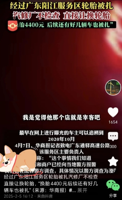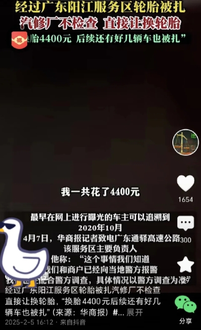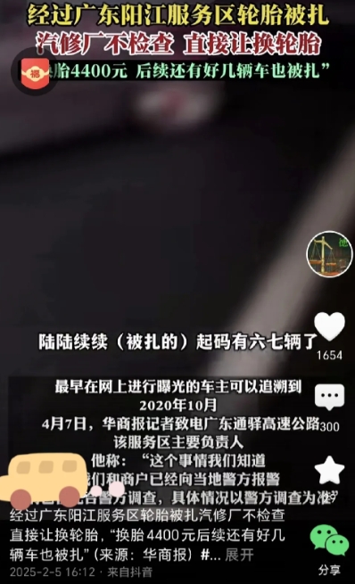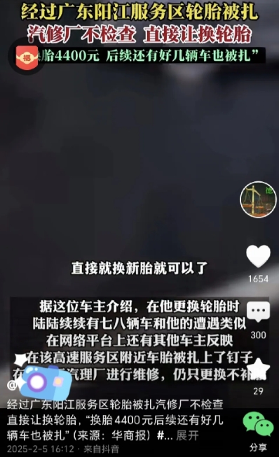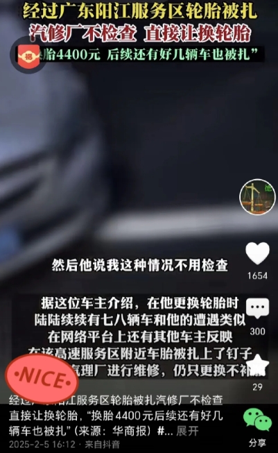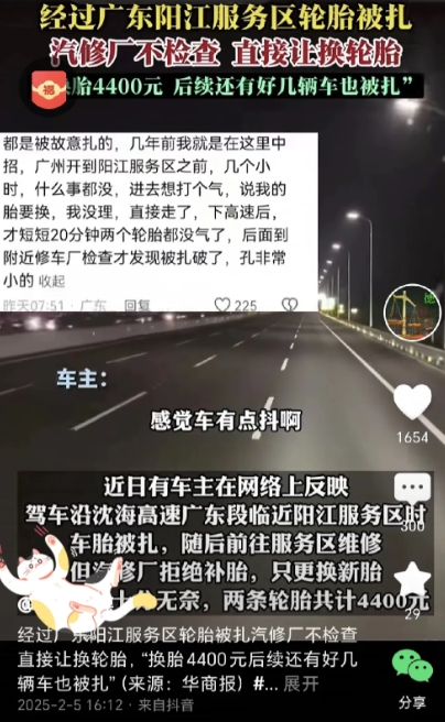 有车主反应,自己开车驾驶在沈海高速上,车子快行驶到广东阳江服务区路段的时候,突然,感觉车轮好像被什么东西扎了,有漏气迹象,急忙选择进入服务区里的汽修站,想要对轮胎进行修补。 谁知道,进去维修站以后,维修站的工作人员,直接拒绝为他提供补胎服务,只能为他更换新轮胎。因为关系到自己的行车安全问题,该车主只能无奈的接受了维修站工作人员的服务要求,花费了4400元,更换了两只新轮胎。 该车主在等待更换轮胎的时间里,陆续看到有7-8辆别的车辆,也开进了汽修站,无一例外,原因都是因为轮胎被什么东西扎坏了,并且,汽修站工作人员,都是只提供换不修的服务。 可是,时间如果再往前追溯的话,早在2020年时,当时,就有经过该路段的车主曝光,也是在这个区域经历过轮胎被扎的情况。想不到,4年过去了,这种“突如其来”的危险情况,依然存在着,让人细思极恐,不寒而栗。 该车主怀疑,过往那么多车辆轮胎被扎,这种情况,应该是有人刻意为之,目的就是为了“宰客”,谋取利益,行为非常恶劣,危险性极大。 其实,这种事情,任何一个正常人都明白,绝对是某个相关利益方,不顾高速来往车主的生命安全,为谋取利益而做出的人为行为。 大家觉得,这种危害到过往车辆安全驾驶的行为,到底是属于道德行为?还是属于违法行为?
