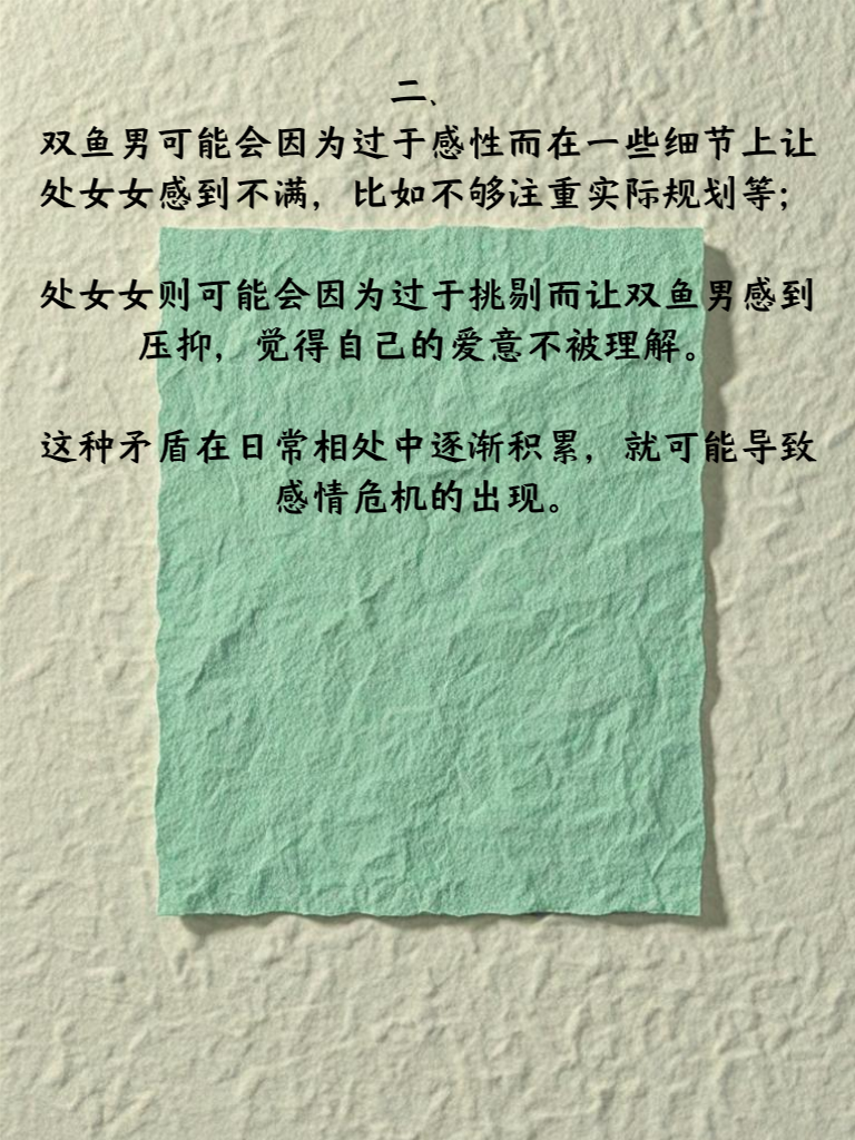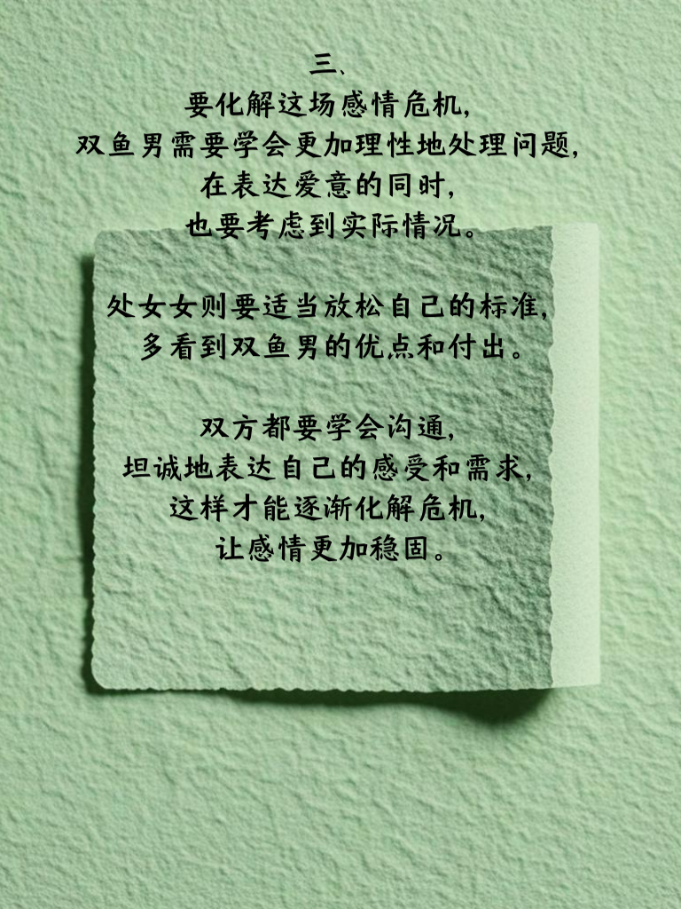 一、双鱼座的男生通常情感细腻且富有幻想,他们在感情中往往会全身心投入,对伴侣关怀备至。而处女座的女生则严谨且追求完美,对于感情有着自己的标准和要求。当这两个星座相遇,起初的吸引或许源于彼此的差异,但随着时间推移,差异也可能引发矛盾。 二、双鱼男可能会因为过于感性而在一些细节上让处女女感到不满,比如不够注重实际规划等;处女女则可能会因为过于挑剔而让双鱼男感到压抑,觉得自己的爱意不被理解。这种矛盾在日常相处中逐渐积累,就可能导致感情危机的出现。 三、要化解这场感情危机,双鱼男需要学会更加理性地处理问题,在表达爱意的同时,也要考虑到实际情况。处女女则要适当放松自己的标准,多看到双鱼男的优点和付出。双方都要学会沟通,坦诚地表达自己的感受和需求,这样才能逐渐化解危机,让感情更加稳固。