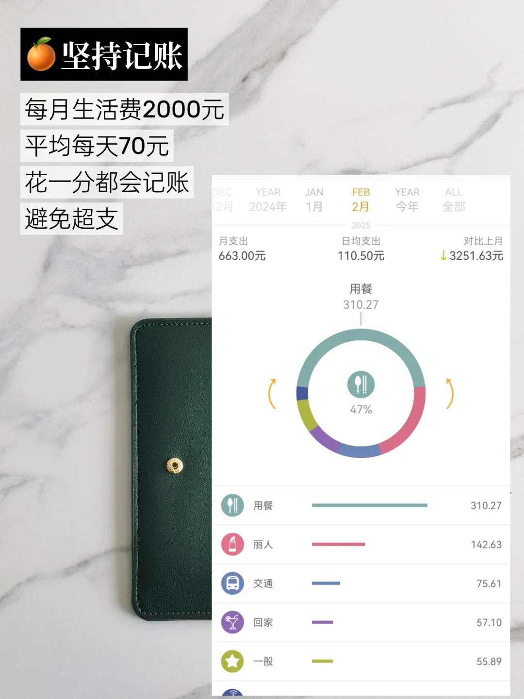 现在,我每个月生活预算只有2000元,一天70元,每天会记账,每月底会总结,哪些是不需要支出,避免乱花。