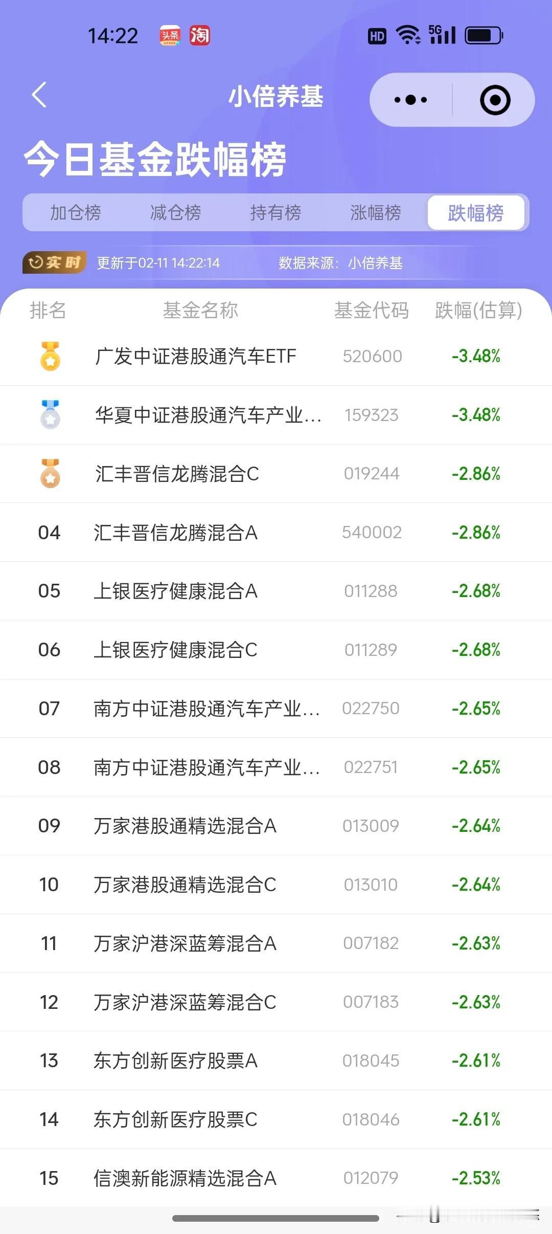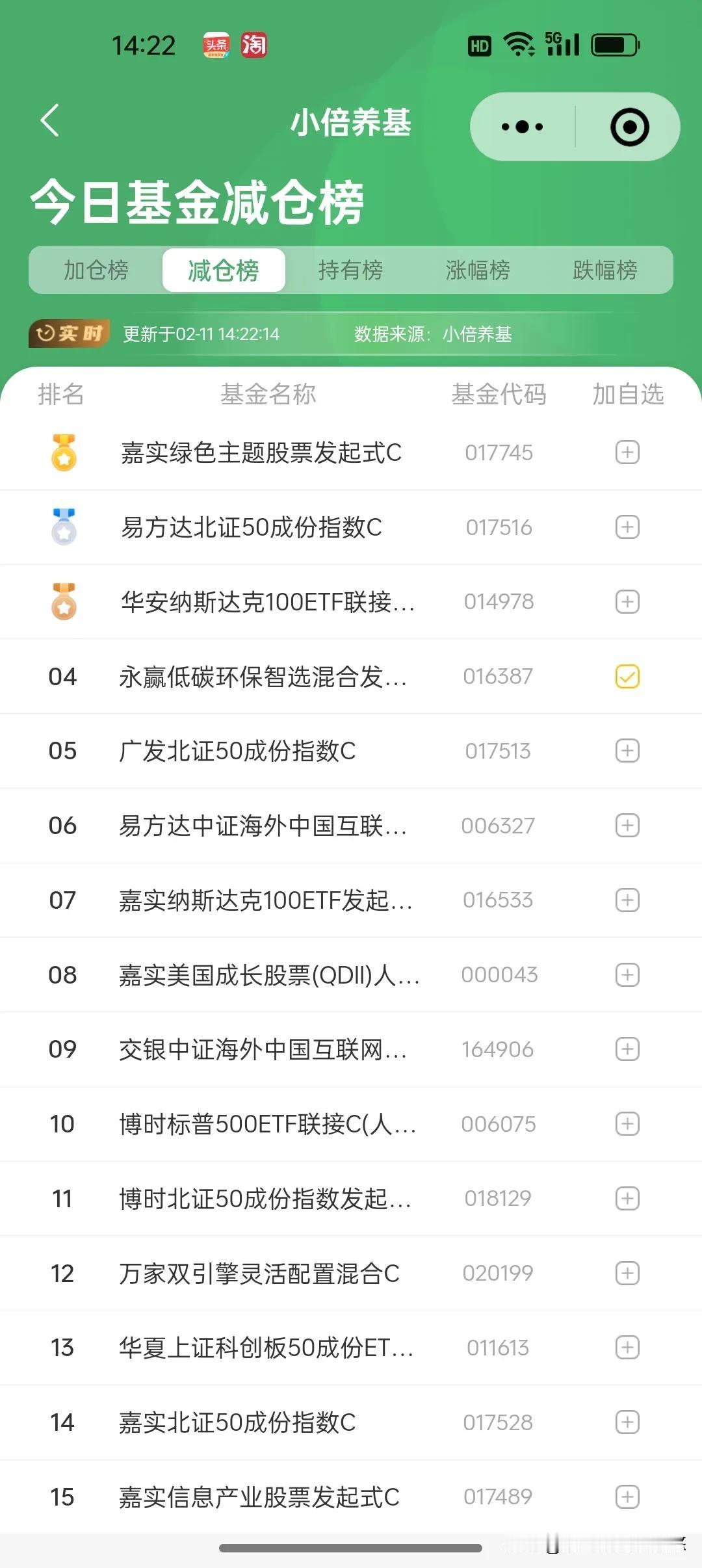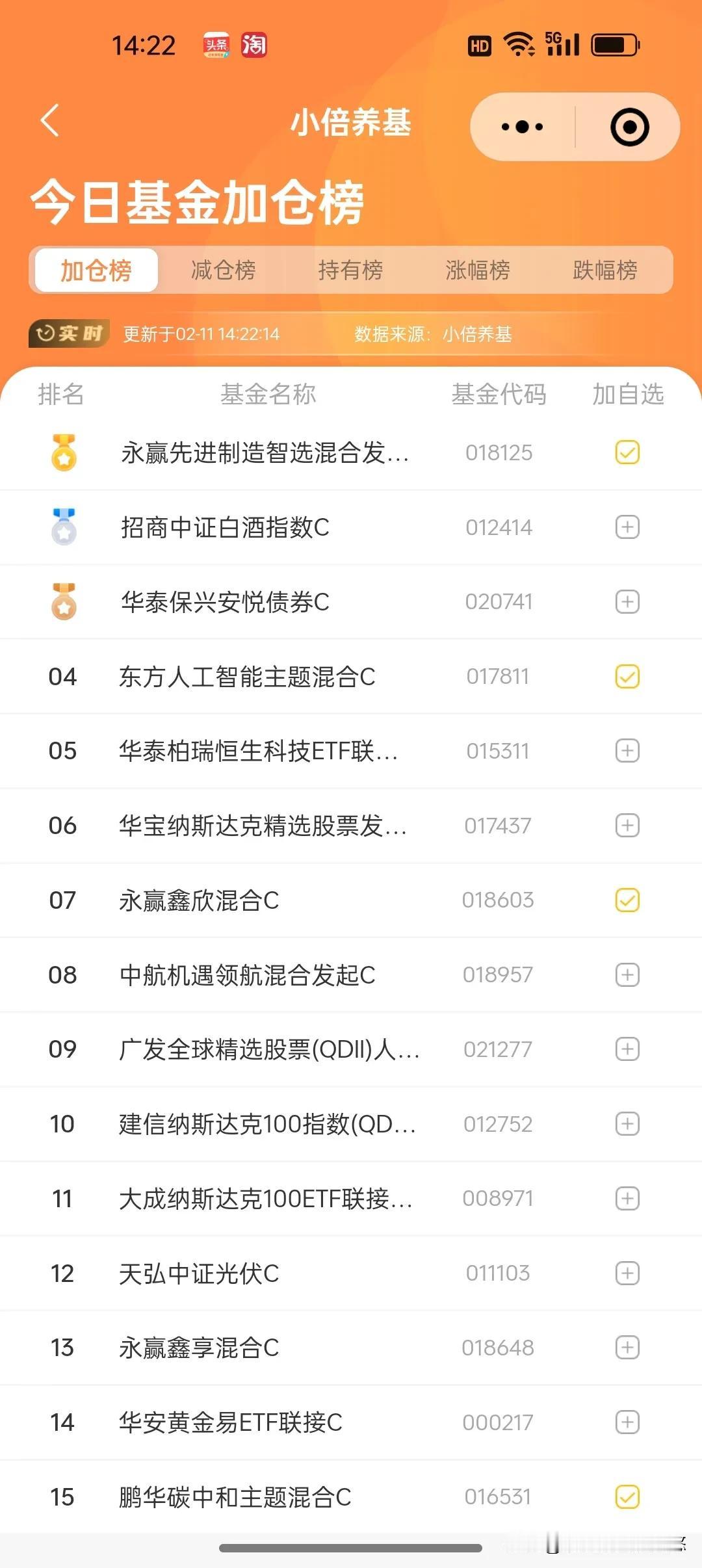 2月11基金看点及加仓减仓榜 今天大盘回踩,探底回升,科技板块获利回吐比较多,证券异动拉升,大盘跌不下去,最多回踩5日线附近。科技与权重仍然没有完成高低切换,科技板块还可以继续格局。 1,恒生科技,前期高点5451点近在咫尺,上行趋势没有改变,激进的持仓待涨,稳健的分期止盈。 2,白酒,中证白酒指数下行趋势没有改变,资金不在这里,多看少动。 3,医疗与医药,医疗已经突破了60日线压力,生物医药与创新药距离60日线还有距离,持仓待涨。 4,光伏设备,今天回踩了年线及5日线支撑,可分期低吸布局。 5,新能源车,回踩5日线支撑,持仓待涨。 6,半导体,科创芯片,消费电子,科创50,今天回踩了5日线支撑,持仓待涨,也可分期止盈。 7,通信设备与cpo,通信设备有望突破前期高点,cpo已经突破1月23日高点,可持仓待涨。 8,计算机 人工智能 大 数据 信创 云计算 软件开发等大科技板块,上涨趋势没有改变,稳健的分期止盈减仓,激进的持仓待涨,不追高。 9,传媒与动漫游戏,中证传媒已经突破去年12月份高点,动漫游戏挑战前高,激进的持仓待涨,稳健的分期止盈减仓,不追高。 10,低空经济,继续上行,有奔前期高点趋势,持仓待涨。最近几天减仓榜靠前,本人多次提示持仓待涨,不要被甩下车! 11,机器人概念,短期上涨幅度比较大,资金获利回吐,板块内股票前后轮动,激进的持仓待涨或者追高,稳健的可分期止盈。 12,有色金属,接近去年12月份高点附近,稳健的分期减仓,激进的可持仓待涨。 13,房地产,煤炭,基建,建材,电力等板块,目前资金不在这里,多看少动,也可分期低吸埋伏。 14,北证50,今突破了60日线后不给加仓机会,空仓轻仓的只有等待回调介入,今天持仓待涨。 15,DS概念,同属于信创云计算软件板块,今天继续上行,没有主题基金,只有几个相近的(比如嘉实信息,银华体育,诺安积极回报,德邦稳增长等)。 以上观点,仅供参考,不构成投资依据。 点赞关注,投资理财不迷路。