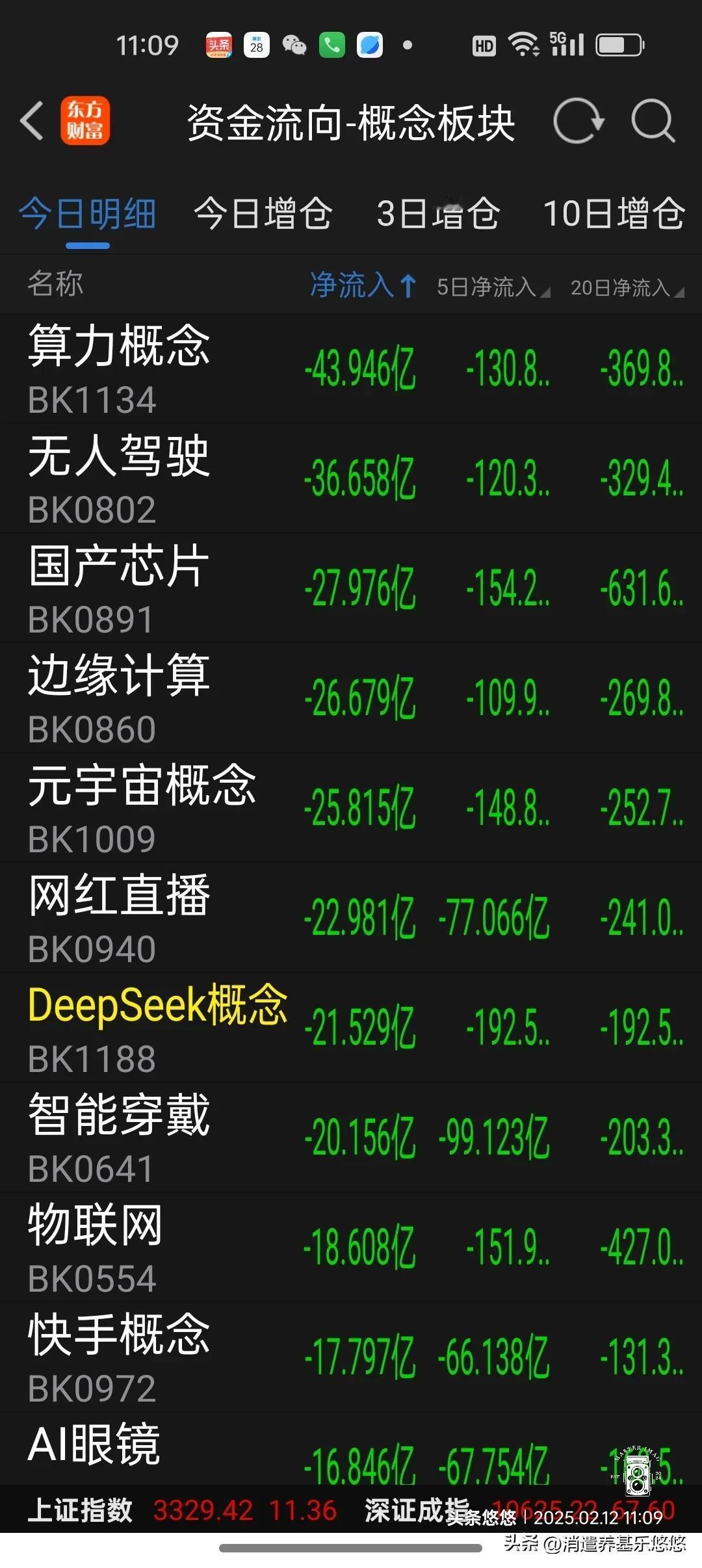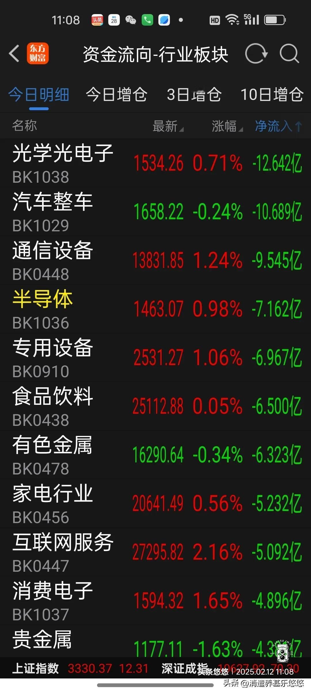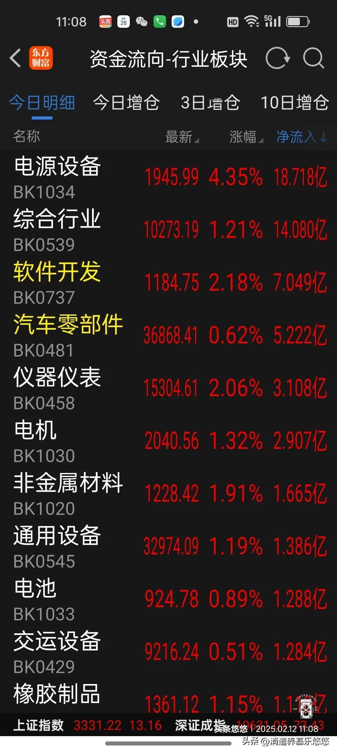 2月12日午间看盘及资金流向加仓榜 今天上午大盘低开高走,反复在60日线附近上下震荡,5日线上升3308,形成短期支撑,本周线有望震荡收红。南向资金流入21亿元 截止时间11点,两市成交额8700亿元,比昨天萎缩570亿元,主力资金流出94亿元。有2890家个股上涨,2200家下跌,涨停个股57家。 盘面上,电源设备,仪器仪表,教育,软件开发,传媒游戏,通信服务,东数西算,国资云,DS等板块涨幅居前。 贵金属,有色金属,汽车整车等板块跌幅靠前。 资金流入靠前的板块有电源设备,软件开发,电机,零部件,交运设备,酿酒等,还有云计算,工业互联,大数据等概念。 资金流出靠前的板块有整车,通信设备,半导体,专用设备,食品饮料,文化传媒等。算力及国产芯片流出较多。 午间加仓榜在评论区里看。