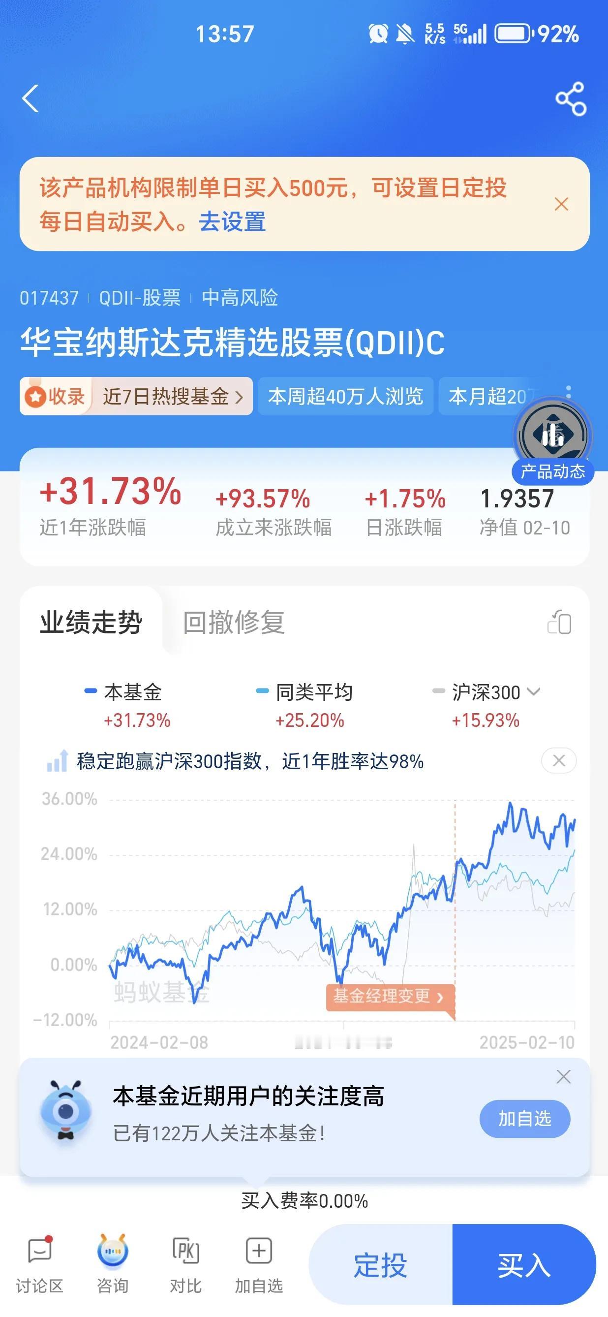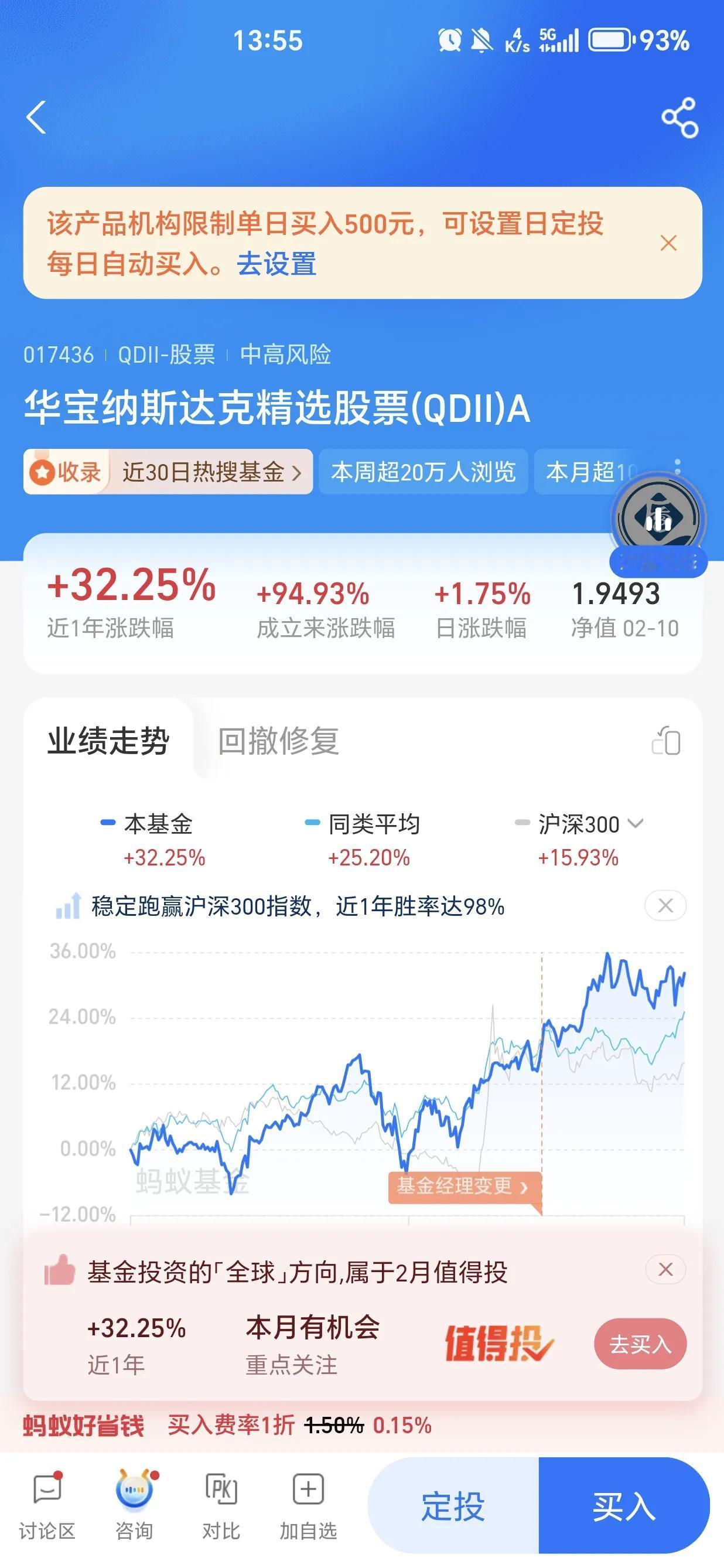 华宝纳斯达克指数基金A(017436)和C(017437)今日起可申购额度500元,两只相当于可以购买总计1000元。一月基本可以满足2万多的定投需求。 对于美股基金,持续无脑的买入持有是跑赢的唯一的方法。