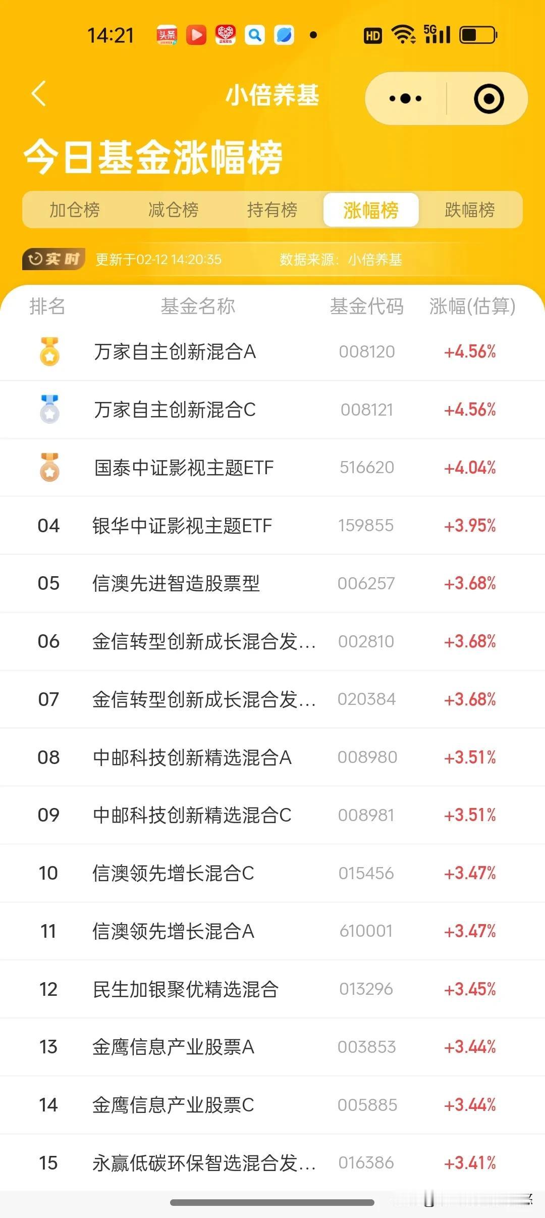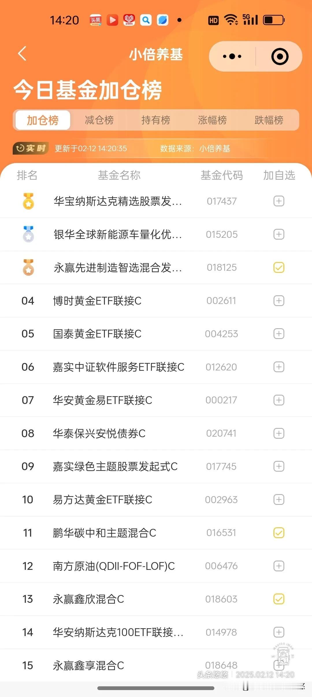 12月12日基金看点及加仓榜 今天大盘在60日线附近宽度震荡洗盘,并试探突破60日线压力,接下来要选择方向,是直接突破,还是回调后再突破,但是最终是走突破向上,本人倾向往上突破。 1,恒生科技,周线macd已经金叉向上,继续看涨,持仓待涨。 2,白酒,中证白酒指数弱势震荡,短期难有行情,多看少动。 3,医疗,中证医疗已经突破了60日线压力,持仓待涨。 4,生物医药与创新药,跌破5日线,回踩10日线支撑,有可能继续挑战60日线压力位,观望或者分期低吸。 5,光伏产业,回踩20日线支撑力度,可分期低吸布局,博弈补涨机会。 6,新能源车,突破60日线后的有回踩,持仓待涨或者分期低吸。 7,半导体、科创芯片、科创50科创100、 消费电子,午后向上突破,持仓待涨,不追高。 8,cpo,指数创新高,持仓待涨。通信设备与其相近。 9,计算机 人工智能 大数据 信创云计算 软件开发等科技板块,最近主线之一,指数创新高,持仓观望。不追高! 10,中证传媒与动漫游戏,强势板块,指数创新高,上涨趋势,稳健的分期止盈减仓,激进的持仓待涨。 11,低空经济,上涨趋势,周macd即将金叉,还有上涨空间,持仓待涨。这几天减仓榜前列,不知道是盈利多多还是怕跌? 12,机器人概念,指数创新高,沿着5日线上行,短期上涨幅度过大,稳健的分期止盈减仓,激进的可持仓待涨。不追高! 13,北证50,上涨趋势,周线macd即将金叉,还有上涨空间,轻仓的可逢低介入,重仓的持仓待涨。 14,DS概念,建议上涨,热度不减,持仓待涨(昨天提示的几个相关基,继续持有)。 以上观点仅供参考不构成投资依据。 点赞关注投资理财不迷路。