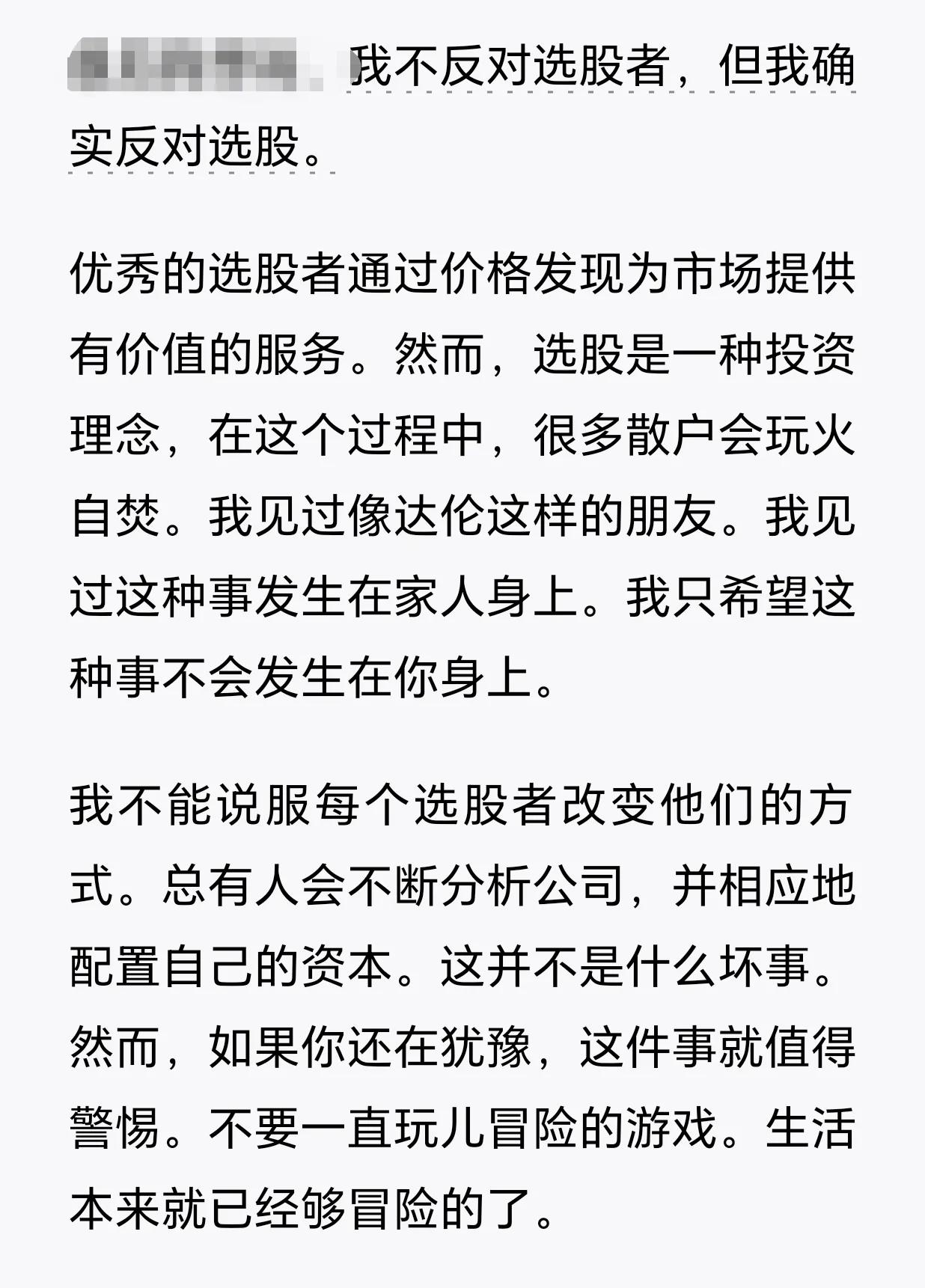 对于投资者需要一个明确的投资就是不要投资个股。这是我经历大A和美股重要的认识。A