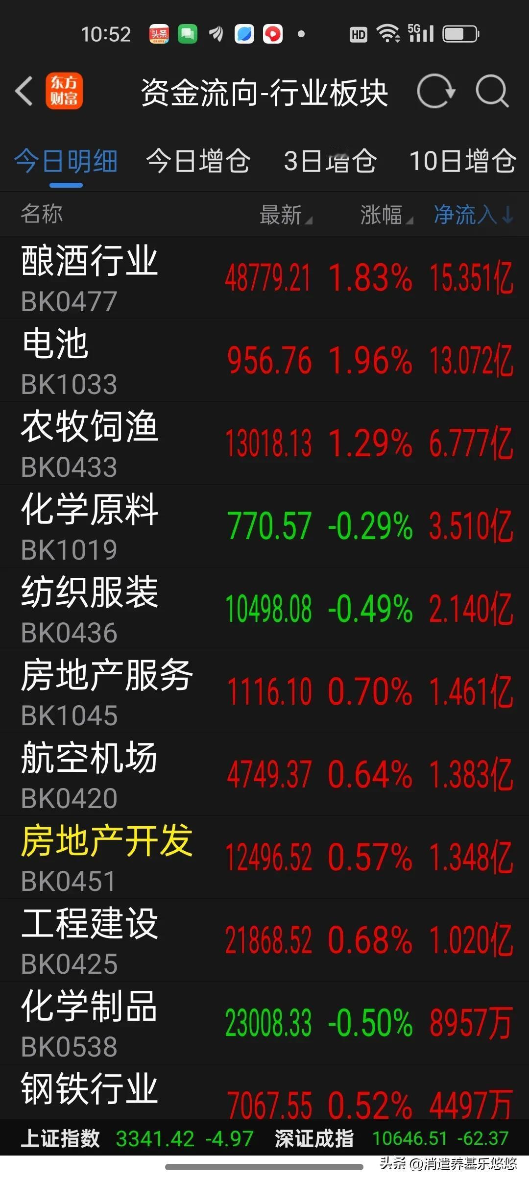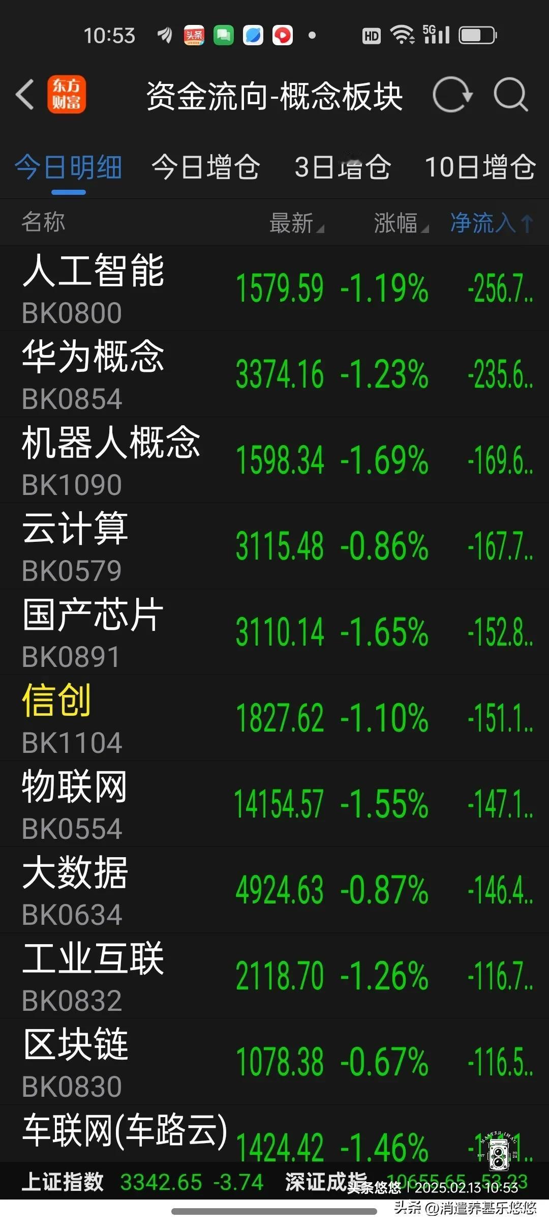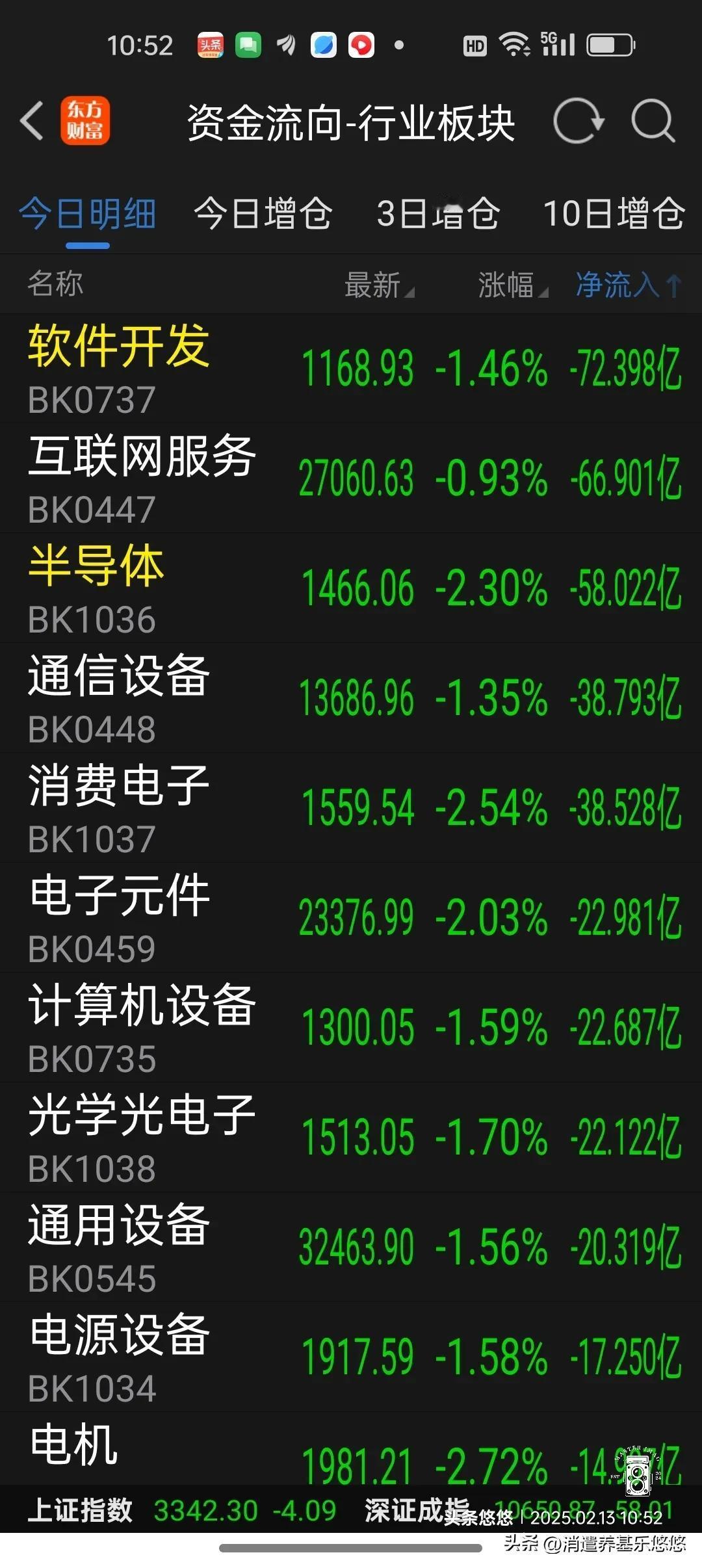 2月13日午间看盘及资金流向加仓榜 今天上午大盘低开冲高回落,科技板块集体回调,5日线还在上升,昨天突破60日线,看今天能否站稳。 截止11点,两市成交额9800亿元,比昨天放量1700亿元,主力资金大幅流出超500亿元,个股涨少跌多,涨停个股42家。 盘面上,电池,酿酒,农牧养殖,文化传媒,航空机场,房地产开发等板块涨幅居前。 消费电子,半导体,电子元件,软件开发,计算机设备等板块跌幅靠前。 资金流入靠前的板块有酿酒电池,农牧猪肉,化学原料,航空机场等。锂矿及麒麟电池。 资金流出靠前的板块有软件开发,互联网服务,通信设备,半导体,消费电子,计算机设备等。还有人工智能大数据云计算等 午间加仓榜在评论区里看。