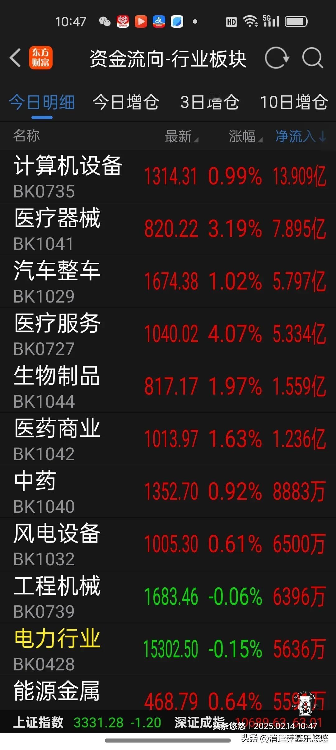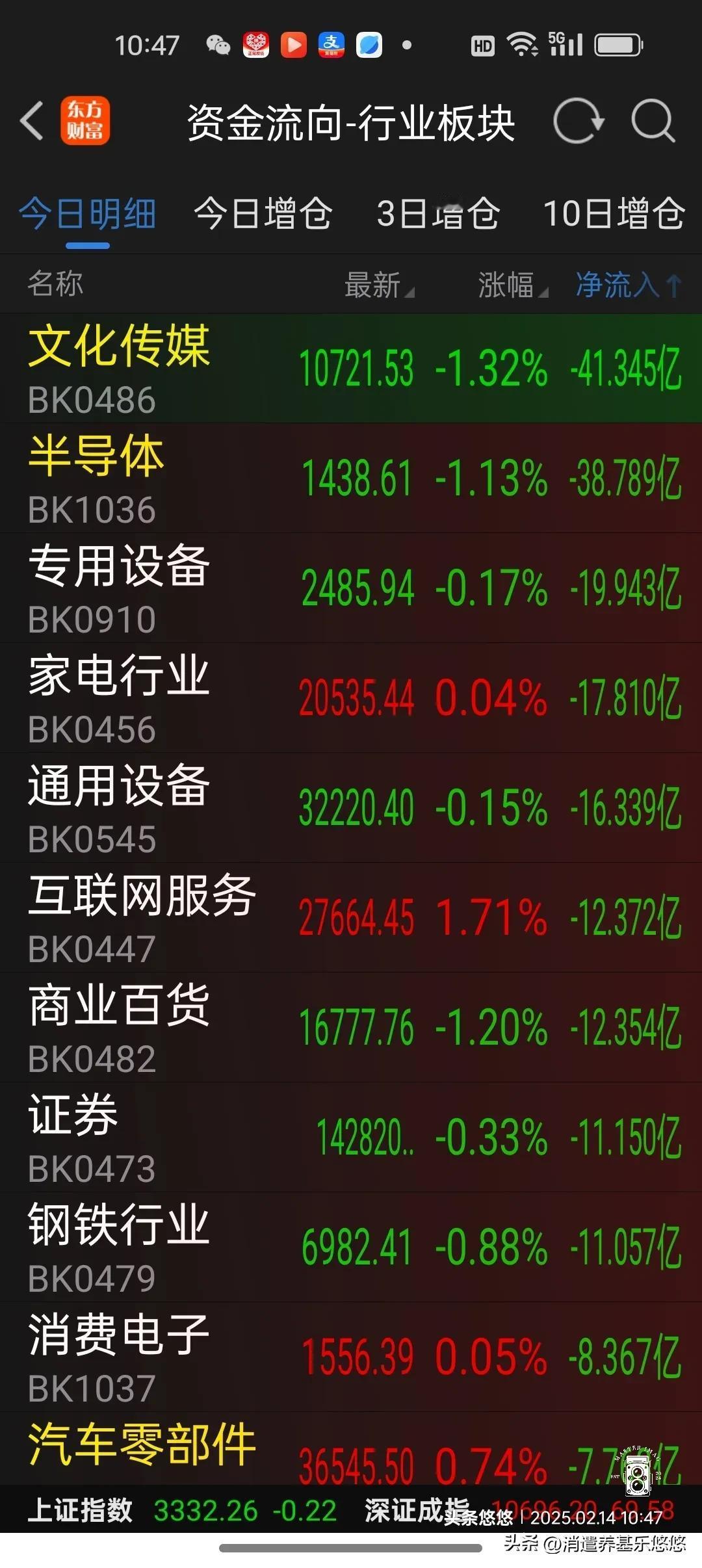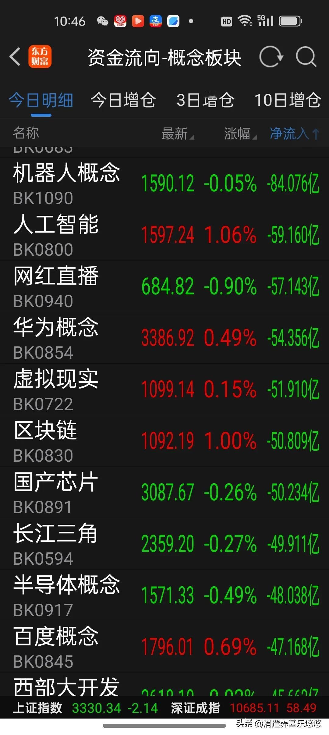 14日午间看盘及资金流向 今天上午大盘震荡整理行情,个股涨少跌多,截止时间11点,两市成交额超8000亿元,比昨天萎缩1500亿元,主力资金流出亿300元,港股热度不减。 盘面上,医疗医药,电池,软件开发,光伏设备等板块涨幅居前。 文化传媒,商业百货,半导体,地产开发,游戏,航空航天等板块跌幅靠前。 资金流入靠前的板块有医疗器械,计算机设备,汽车整车,能源金属等。 资金流出靠前的板块有文化传媒,半导体,家电,互联网服务等。人工智能,机器人,国产芯片等。 看后不忘点赞关注投资理财不迷路。