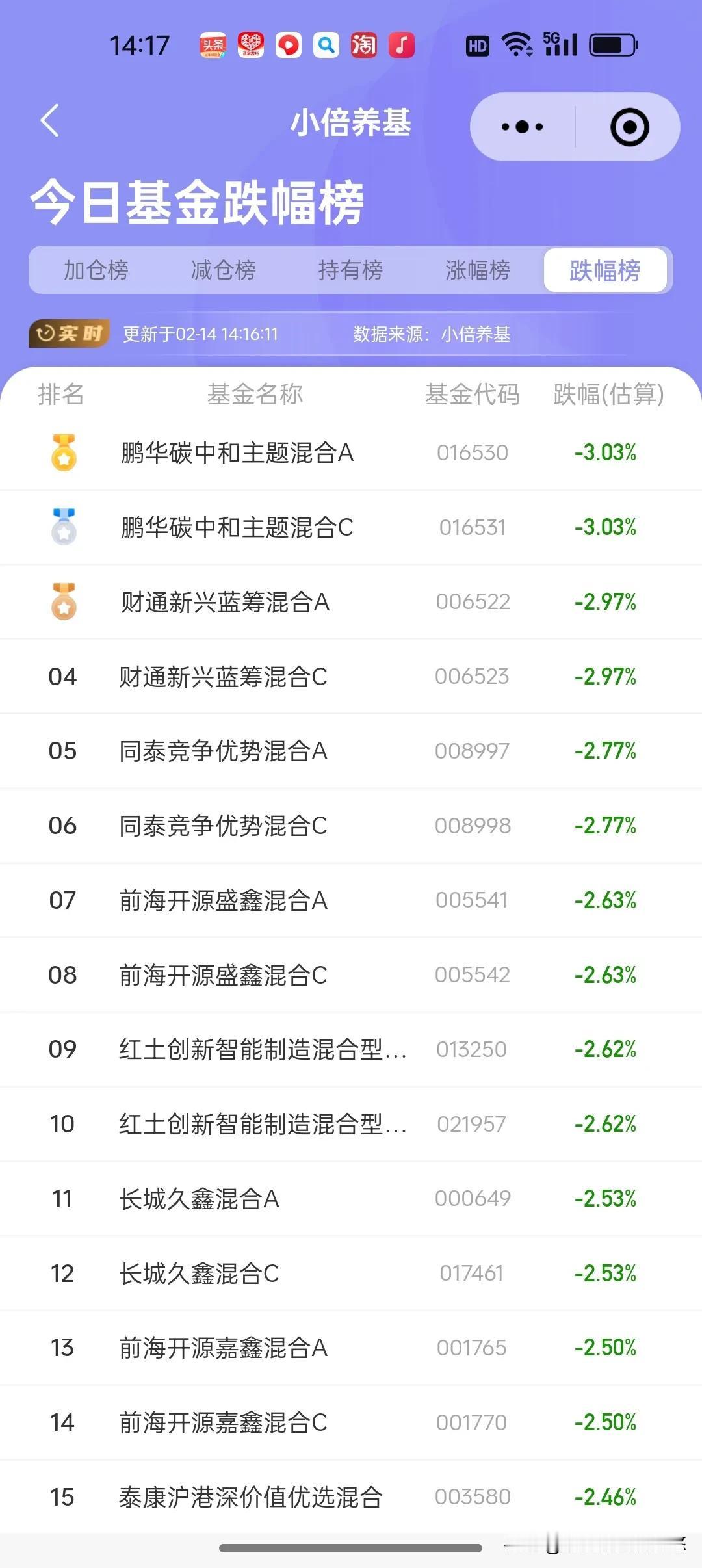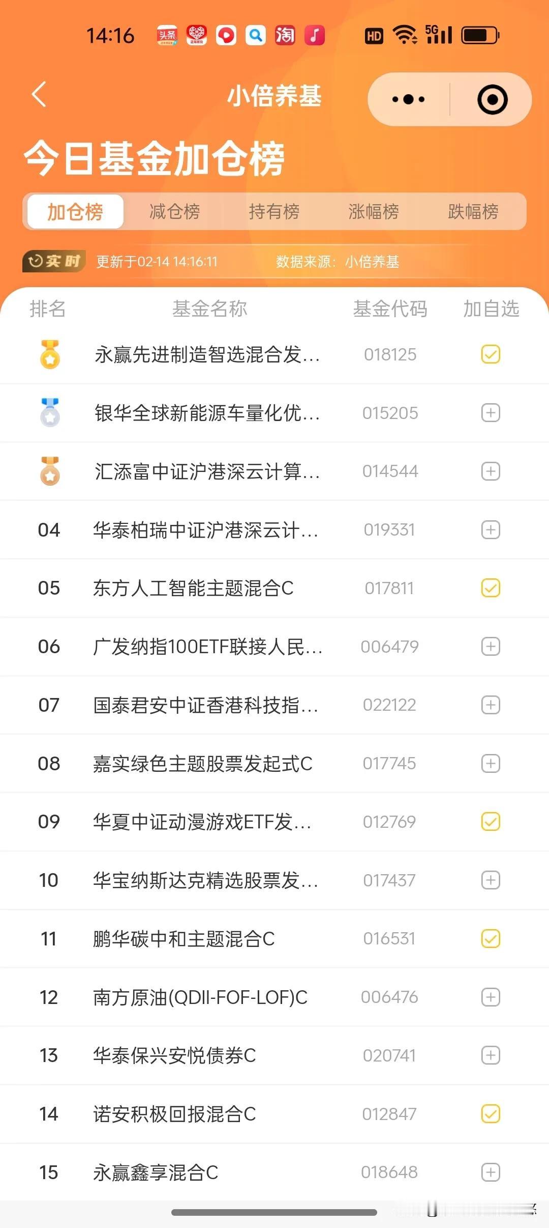 2月14日基金看点及加仓榜 今天大盘下探回升,5日线收回来了,看来昨天就是洗盘,科技板块分化,还没有退潮。 1,恒生科技,已经突破5451点前期高点,昨天洗盘,本人盈利30%已经被洗出来了,看趋势还有上涨空间,稳健的分期止盈减仓,激进的持仓待涨。 2,白酒,中证白酒指数突破30日线压力位,持仓待涨。 3,中证医疗,强势反弹,有奔前期高点趋势,持仓待涨。 4,生物医药与创新药,接下来应该跟上医疗走势,先突破60日线压力位,持仓待涨。 5,光伏产业,弱势震荡整理,会补涨的,持仓待涨或者分期低吸布局。 6,新能源车,即将突破前期整理平台压力位,周线macd刚刚金叉,持仓待涨。 7,半导体,科创芯片,消费电子,科创50,今天回踩了10日线支撑,短期回调后,有可能继续上行,持仓待涨,也可分期止盈减仓。 8,cpo,主题基金持有的前排股票今天多数回调,稳健观望,激进的可适当低吸。 9,计算机 人工智能 大数据 信创云计算 软件开发等科技板块,强势板块,稳健的分期止盈减仓,激进的持仓待涨。 10,传媒与动漫游戏,继续高歌猛进,进入主升浪阶段,持仓待涨。 11,低空经济,目前收回5日线,上升趋势没有改变,周线mscd即将金叉,还有上涨空间,稳健的分期止盈减仓,激进的持仓待涨。 12,人形机器人,跌破5日线支撑,今天回踩了10日线支撑,稳健的观望,激进的也可以适当低吸。 13,房地产,一日游行情,主力资金短期不愿意待在这里,多看少动。 14,北证50,下探回升,收回5日线,周线趋势向上,持仓待涨。 15,DS概念,继续上行,热度不减,持仓待涨。 以上观点,仅供参考,不构成投资依据。 点赞关注,投资理财不迷路。