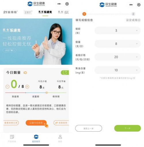 为进一步提升戒烟成功率,民生健康同步推出配套控烟管理小程序,构建“药物治疗 + 数字陪伴”的创新服务体系。小程序结合药物治疗节奏,提供每日戒烟打卡、用药提醒、戒断反应指导、情绪管理与阶段性鼓励等功能,陪伴戒烟全周期,帮助用户形成持续戒烟的行为动力。系统设计中融入了心理学干预理念与数据追踪机制,让用户在戒烟的每个阶段都能获得科学指导与正向激励,实现从“开始戒”到“坚持戒”的可持续转变。