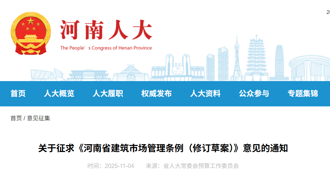 近日,河南省人大常委会公布《河南省建筑市场管理条例(修订草案)》,并向社会各界征求意见建议,截止日期为2025年11月1