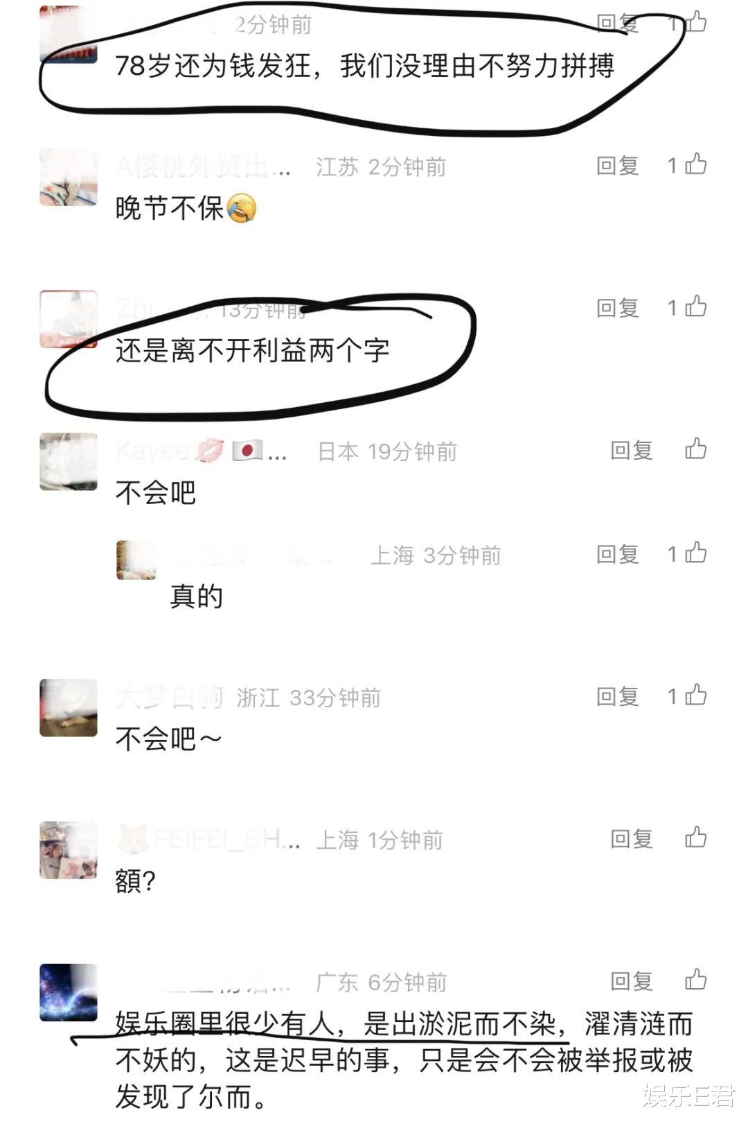 网友们也纷纷感慨:“78岁还在为钱发狂,我们没理由不努力拼搏。”“还是离不开利益两个字。”“娱乐圈很少有人出淤泥而不染,这是迟早的事。”