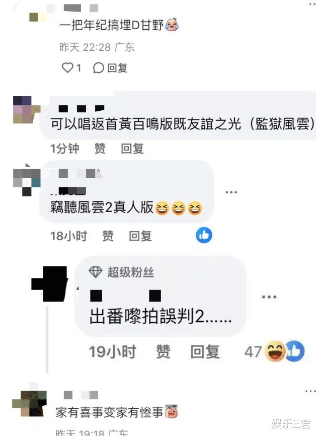 还有网友用电影的段子调侃:“可以唱黄百鸣版的《友谊之光》”“《窃听风云2》真人版”“出来就可以拍《误判2》”“《家有喜事》变《家有惨事》”