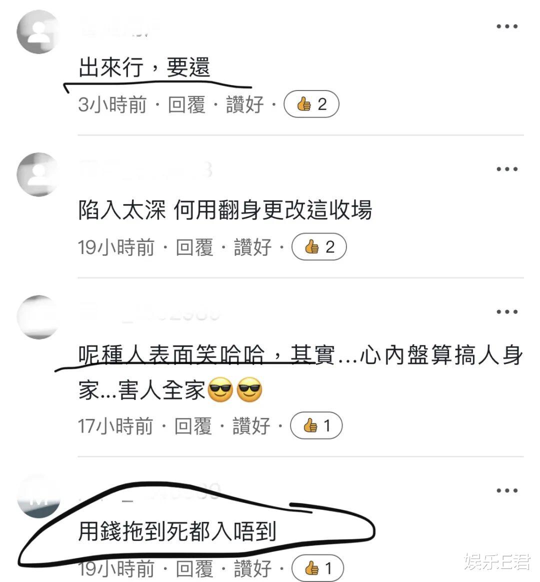 一些香港网友更是直言:“出来混是要还的。”“这种人表面笑哈哈,其实内心盘算搞人身家。”也有网友认为黄百鸣可以保释,用钱拖到死都不一定能坐牢。
