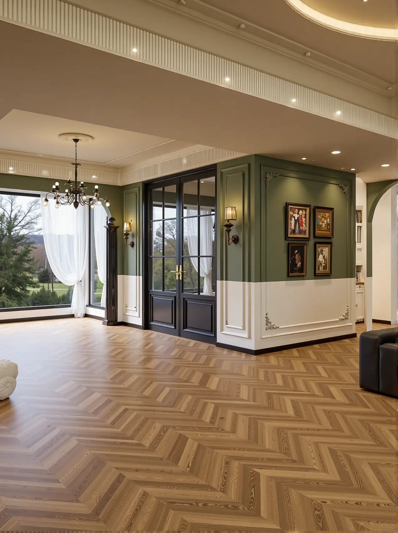 硬装结束的法式复古装修,当复古绿乳胶漆与哑光黑邂逅,雕花石膏线勾勒出复...