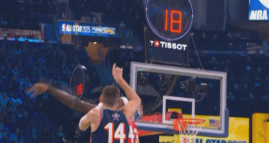 在肯尼队vs巴克利队的全明星赛中,希罗持球过半场,一通控运以后,他面对着西亚卡姆的扑防直接干拔三分出手,皮球在空中划过一道美丽的弧线后稳稳命中,为球队迫近分差