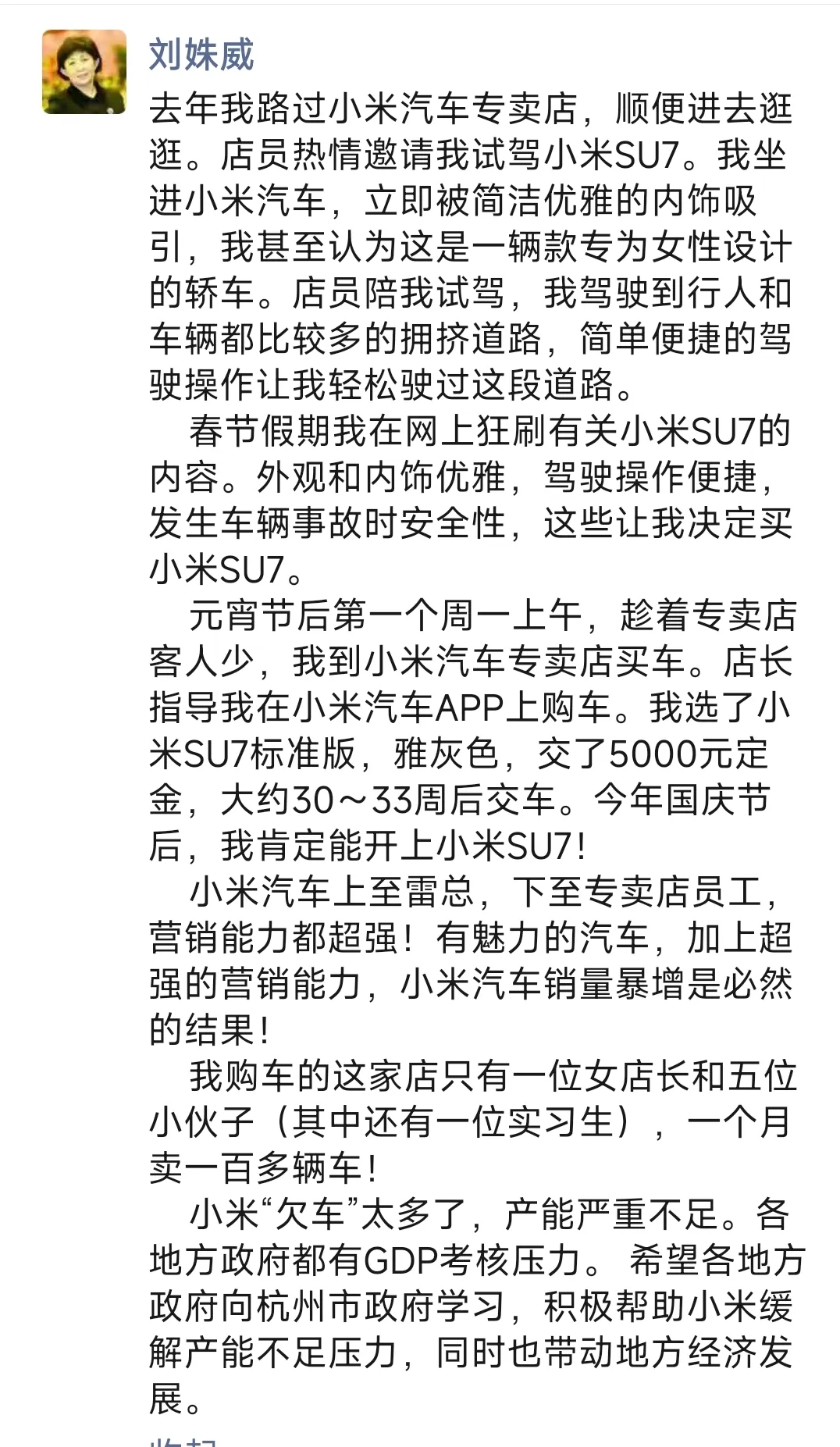 晚上刷朋友圈时,发现刘姝威教授居然也定了一台小米SU7,并且对小米汽车和专卖店的服务大加赞美,并称小米汽车销量暴增是必然结果。