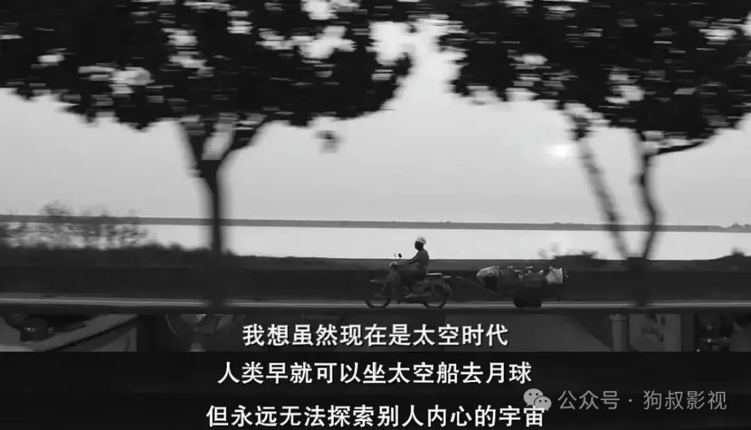 通篇采用黑白与彩色,构成了两个无法交通的世界。菜埔和肚财的世界是黑白的。这黑白并非简单的滤镜效果,而是一种生存状态的精准描摹。它浸透在工厂门房的每一个角落,浸透在肚财那个由废弃太空舱改造的、漏雨的家里,浸透在他们分食的过期便当和共享的廉价香烟里。
