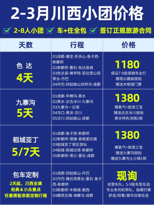 👉最新的2-3月价格清单现已出炉,这个时候来川西真的是让你每一分钱都将花得值得!今天整理了2-3月川西纯玩小团的跟团费用,姐妹们赶紧收藏起来吧,避免多花冤枉钱!!!