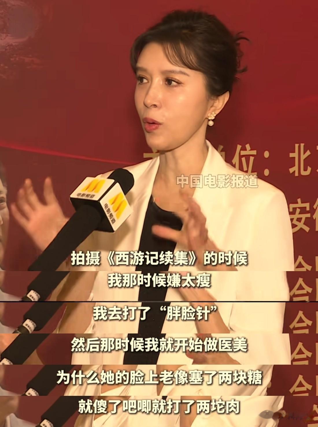 她很后悔当初自己在拍摄《西游记续集》的时候,因为自觉自己的瓜子脸太瘦,于是去做医美打了胖脸针,结果上镜后观众反映很不自然,两腮像塞了两块糖一样鼓囊囊的,后来她又不得已去打针把两边的脂肪给融掉了。