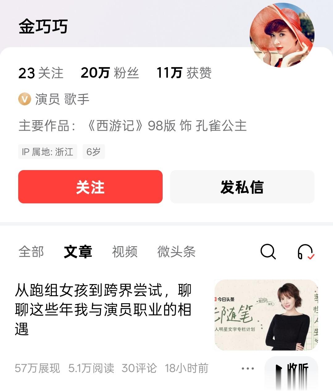 谁能想到,当年在荧屏中活跃的大明星金巧巧,居然入驻今日头条写文章了!