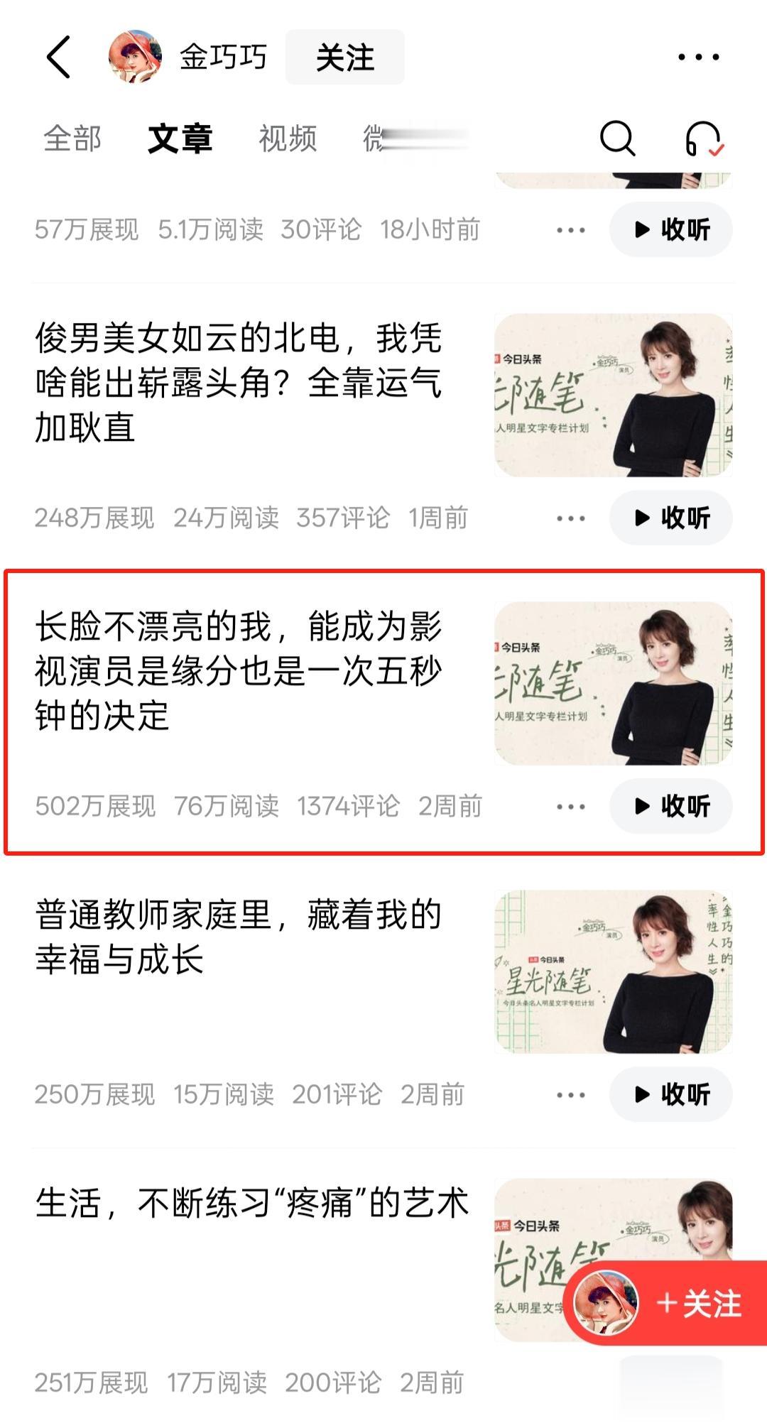 近日,有网友发现,演员金巧巧已在今日头条发表了数篇文章,文章内容以《金巧巧的率性人生》主题展开,明星写文是今日头条名人、明星专栏计划之一,明星入驻可能有相关资金、流量扶持。