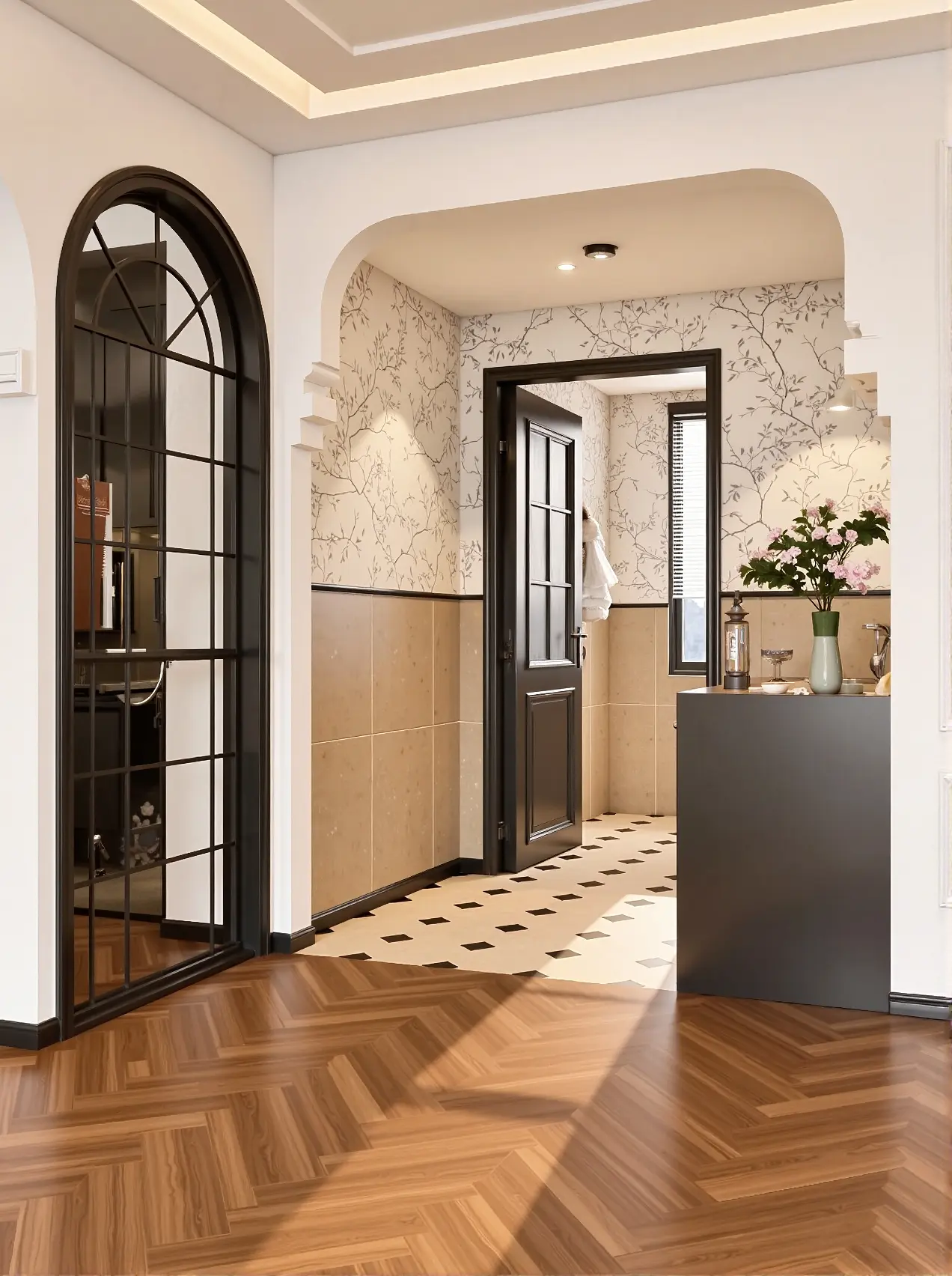 被法式复古装修的高级感狠狠拿捏了~奶油色墙面搭配深色木纹砖,精致的雕花...