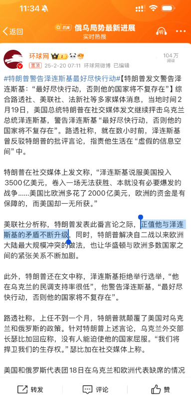 #特朗普警告泽连斯基最好尽快行动#【特朗普用喜剧演员称呼泽连斯基】当地时间2月19日,特朗普再次用“喜剧演员”称呼泽连斯基。他表示泽连斯基操控了拜登政府,导致了乌克兰危机的持续,“泽连斯基做得太差了。”(央视)