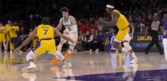 在湖人对阵黄蜂的最后一分钟,詹姆斯上线拿球直塞内线的八村垒,后者在禁区内博得罚球得机会,此时湖人94-96落后两分,但是小日子竟然两罚不中。