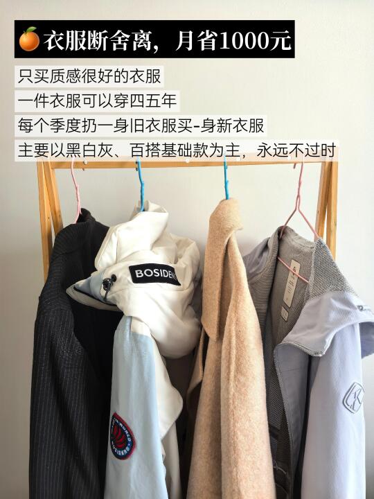 现在我只买质感很好的衣服,一件衣服可以穿四五年,每个季度扔一身旧衣服买-身新衣服。主要以黑白灰、百搭基础款为主,这样永远不过时。