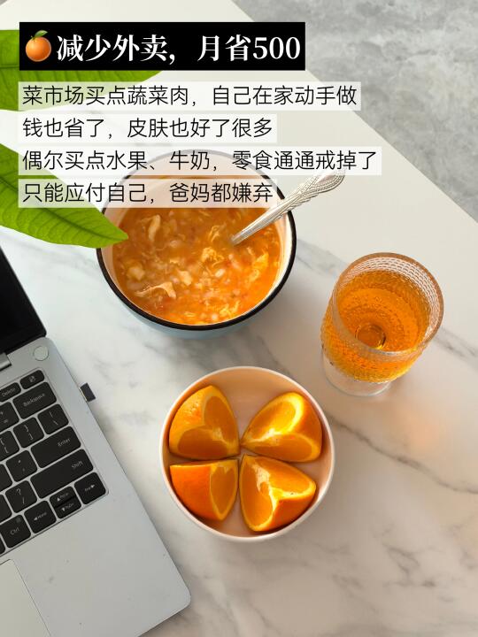 现在菜市场买点蔬菜肉,自己在家动手做,一个月700元,钱也省了,皮肤也好了很多。平时会买点水果、牛奶,零食通通戒掉了。