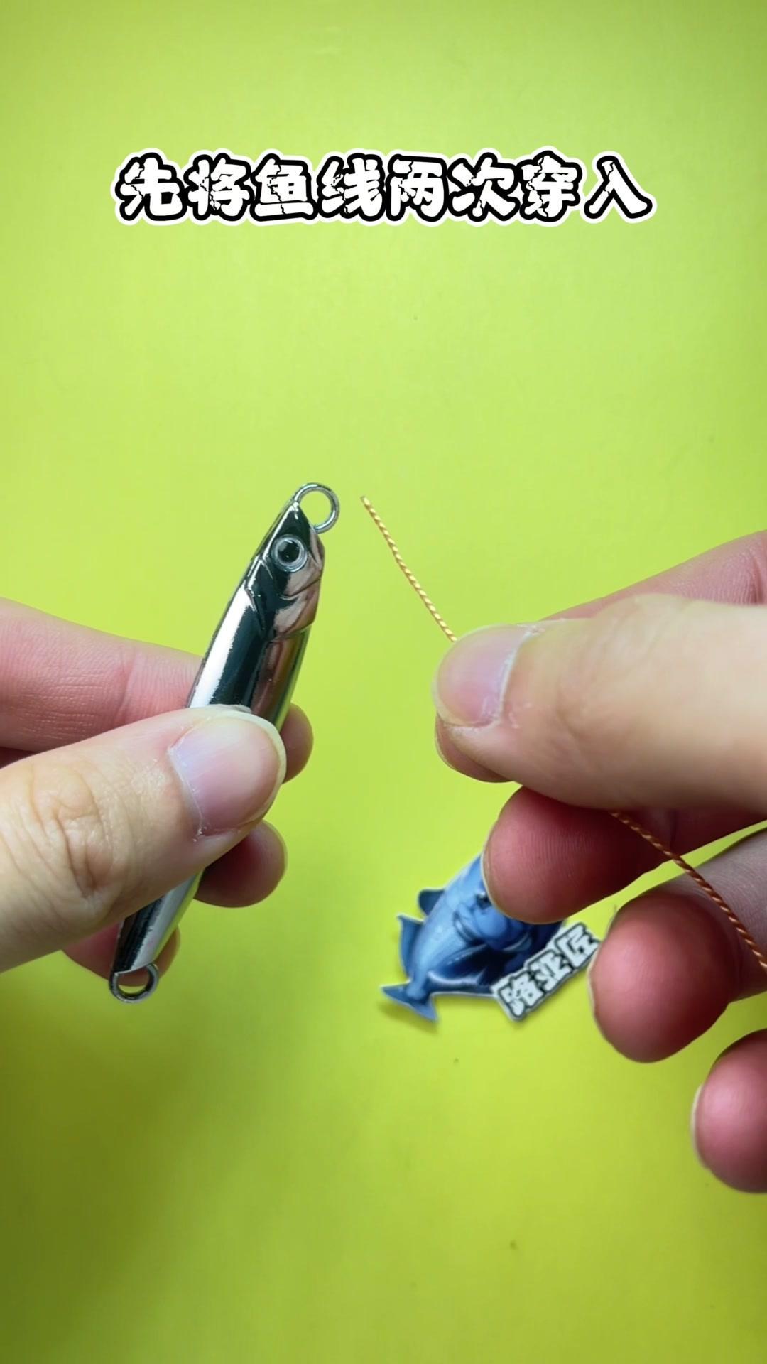 1️⃣将鱼线两次穿入铁板,预留一个小线圈,注意线圈不要打死。 2️⃣右手双指捏