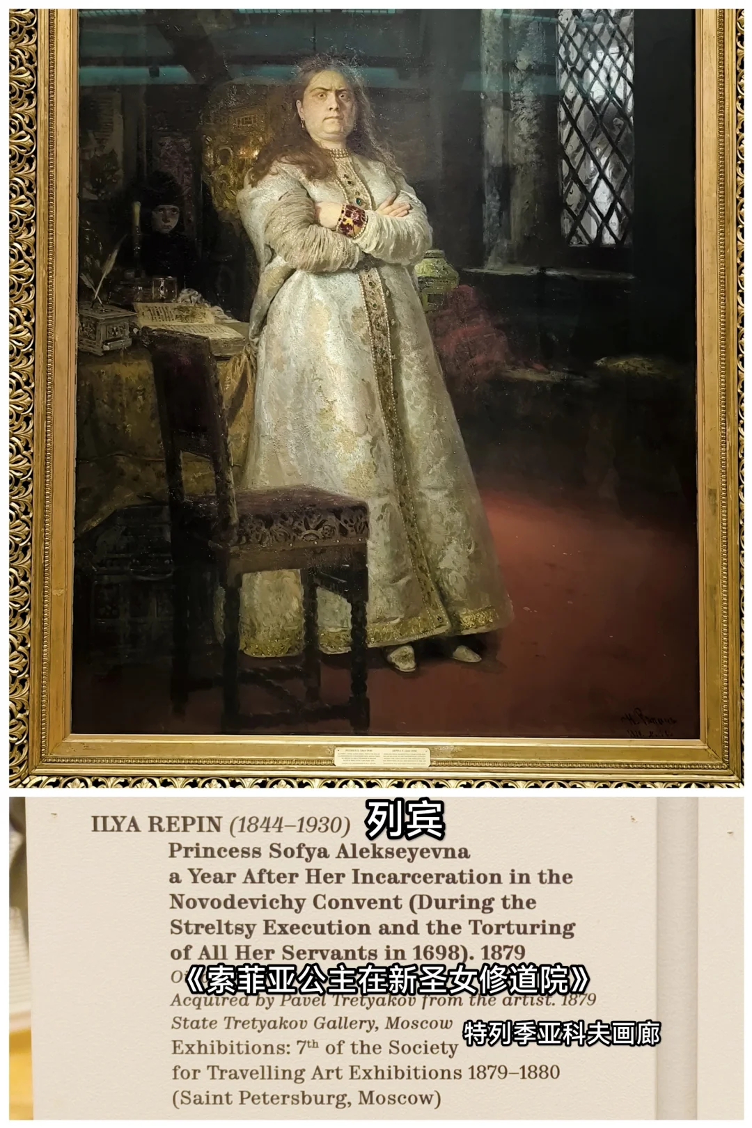 1879年,俄国肖像画大师伊利亚·列宾创作了世界名画《索菲亚公主在新圣女修道院》,今收藏于莫斯科特列季亚科夫画廊。