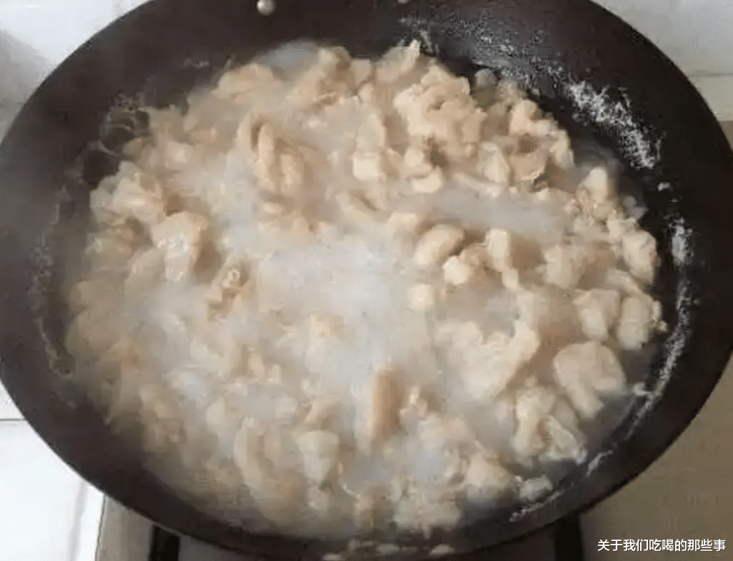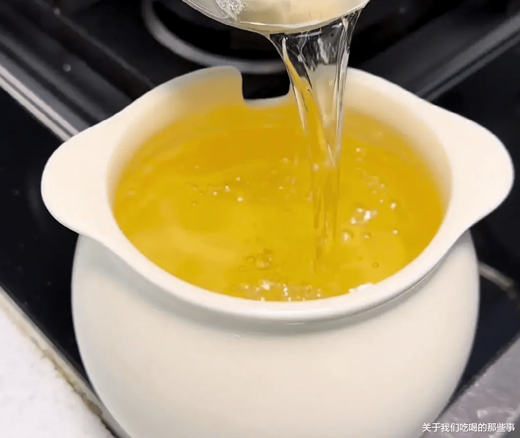 锅内加入半碗水,开大火,等到煮开了不停翻动。煮猪板油的过程中,一开始液体是浑浊的,慢慢地会变清亮。