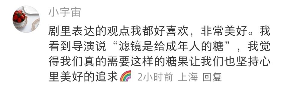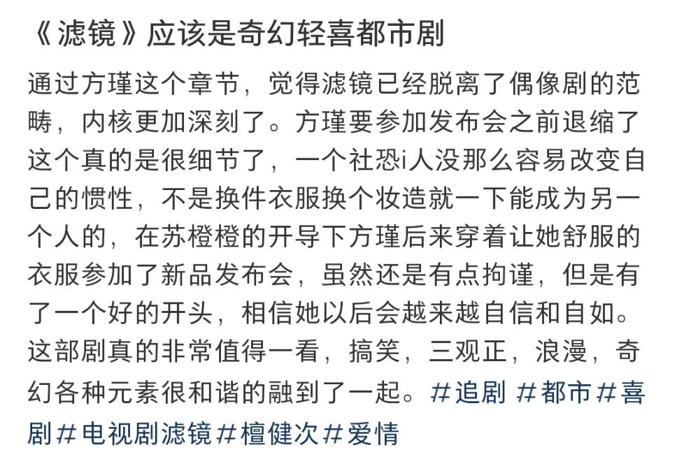 真的感觉《滤镜》立意越来越深刻了,从苏渺到方谨,节奏好,剧情好,立意循序渐进,慢慢来,大家各平台安利的时候可以像这样深度讨论一下,这么好的剧内核应该被更多人看到!而且用喜剧的手法去讲这些,不会有说教的感觉,还能引起共鸣,这在内娱影视剧里真的很少见!