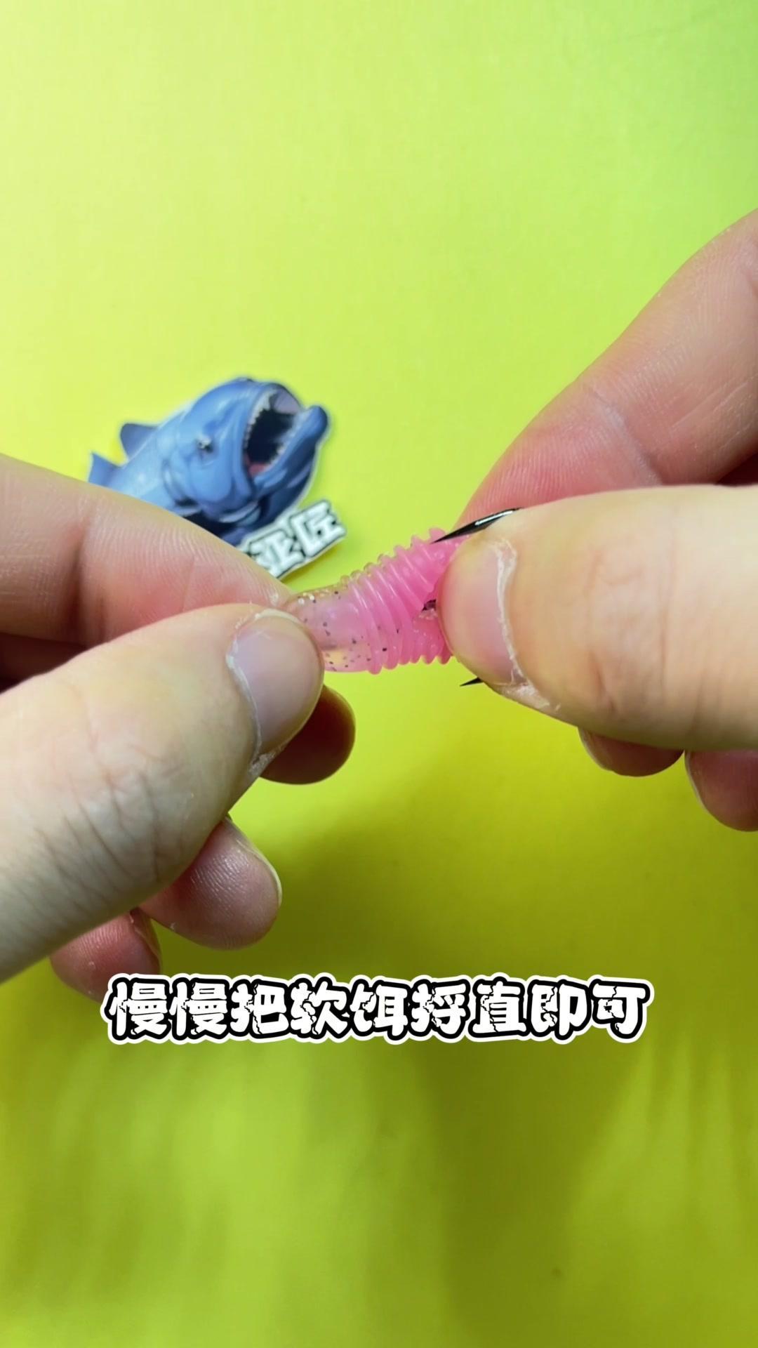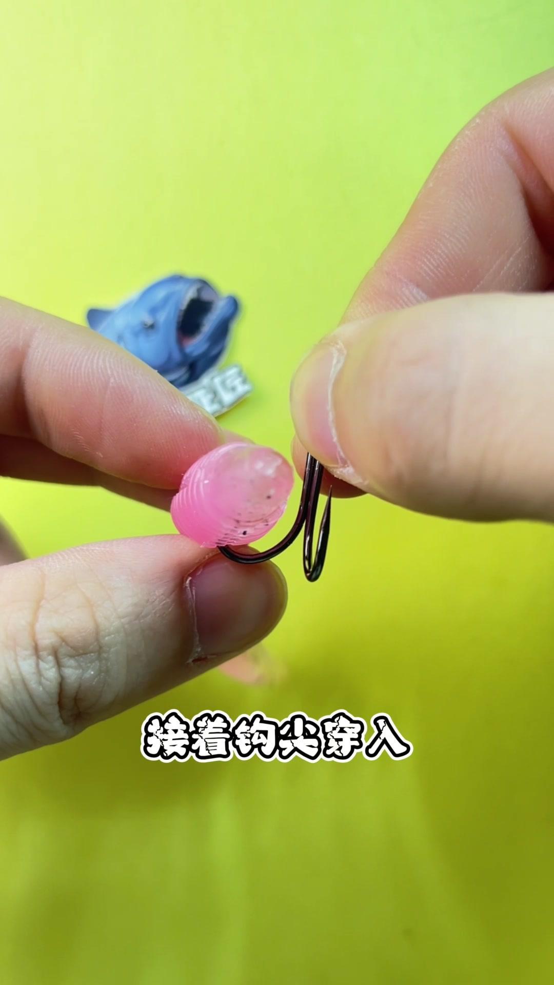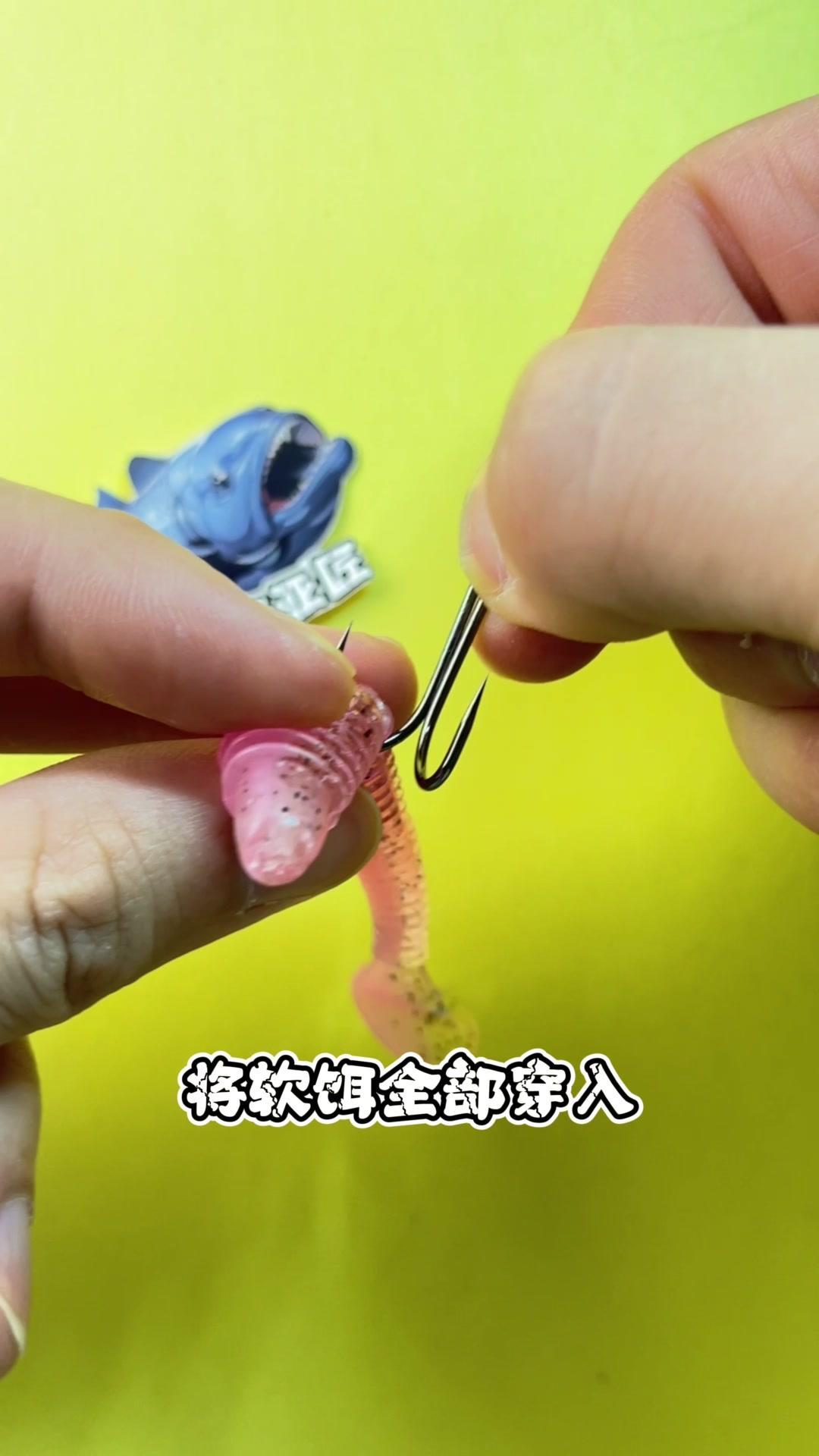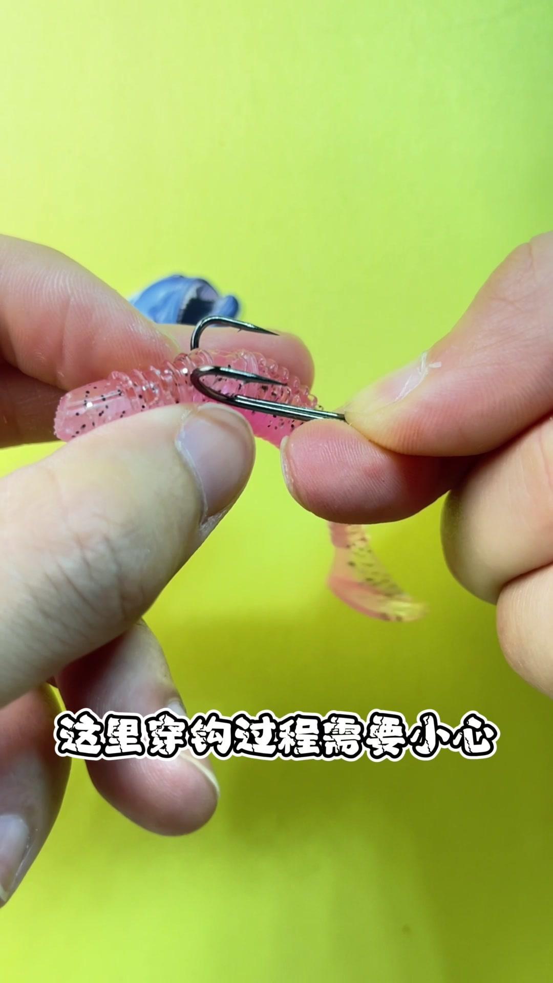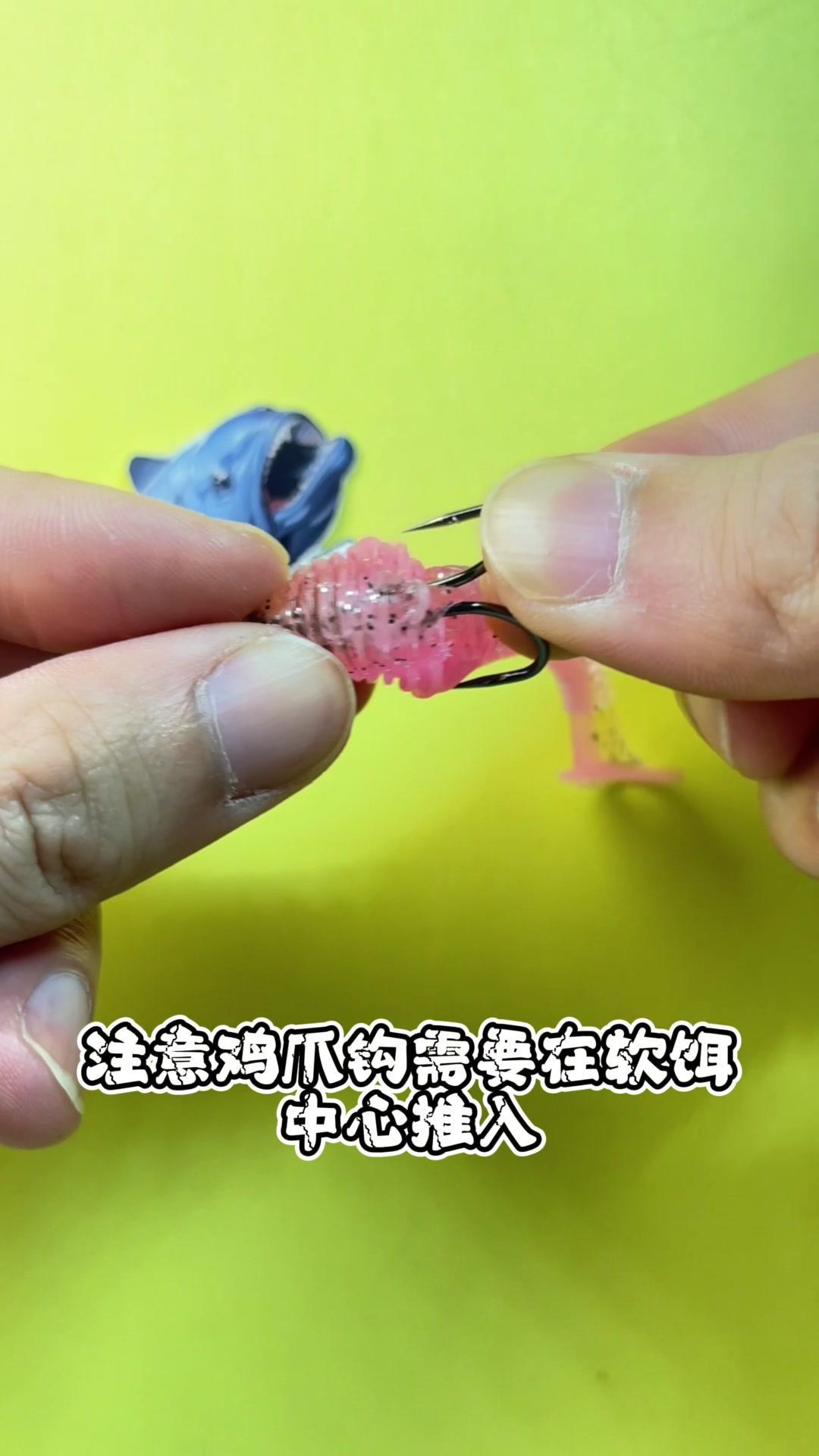 1️⃣比对鸡爪钩与软饵长度。 2️⃣钩尖穿入,将软饵全部穿入。 ❗注意:穿钩过程需要小心,以免误伤。鸡爪钩需要在软饵中心推入,慢慢把软饵捋直即可。