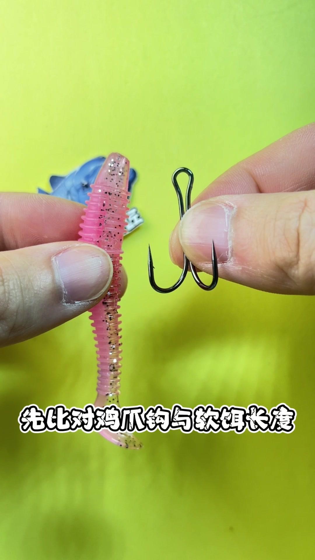 1️⃣比对鸡爪钩与软饵长度。 2️⃣钩尖穿入,将软饵全部穿入。 ❗注意:穿钩过程