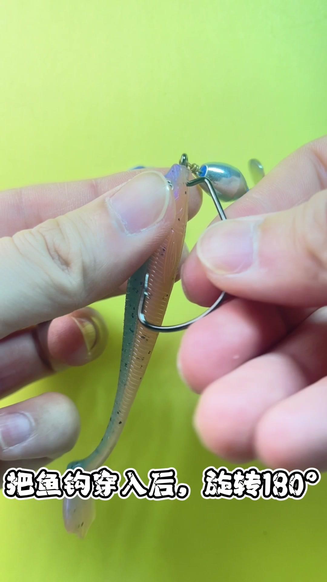 1️⃣先将钩尖穿入软饵头部,把鱼钩穿入后旋转180度,以对钩身长度。 2️⃣从软饵腹部中间穿入,注意钩尖埋入软饵背部。 你学会了吗❓